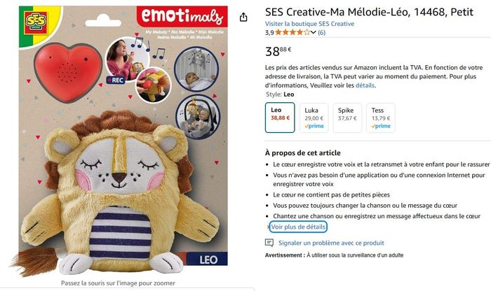 Peluche Emotimals Léo le Lion Marque SES Créative Permet d'enregistrer votre voix et la retransmet à votre enfant pour le rassurer Vous n’avez pas besoin d’une application ou d’une connexion Internet pour enregistrer votre voix Le cœur ne contient pas de petites pièces Vous pouvez toujours changer la chanson ou le message du cœur Possibilité d'accrocher la peluche au lit ou au siège auto N'hésitez pas à voir mon dressing, jusqu'à -25% sur les lots !