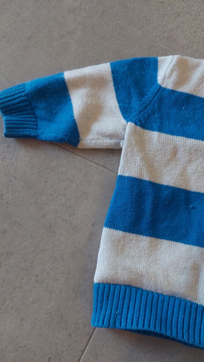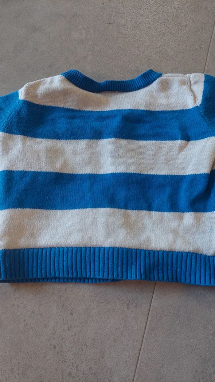 Pull en très bon état global mais déjà utilisé. État conforme aux photos. Rayures blanches et bleues marines