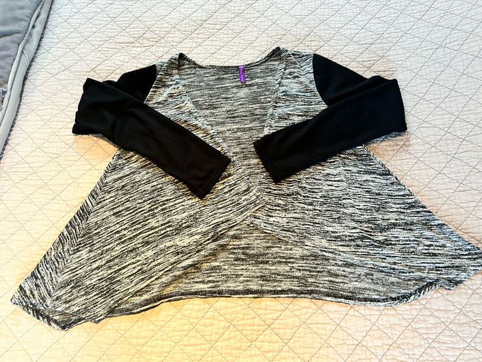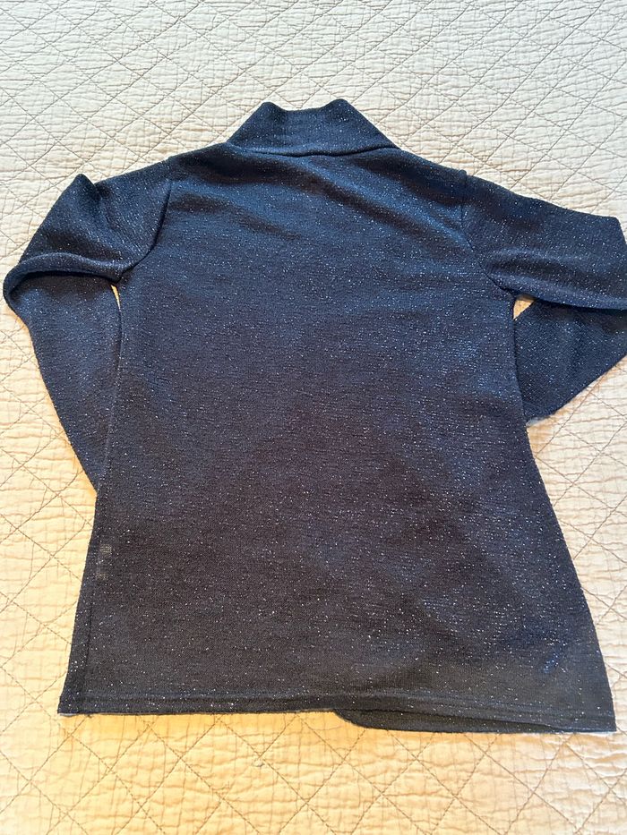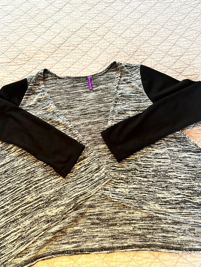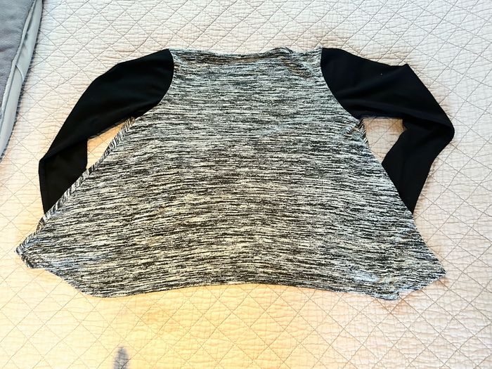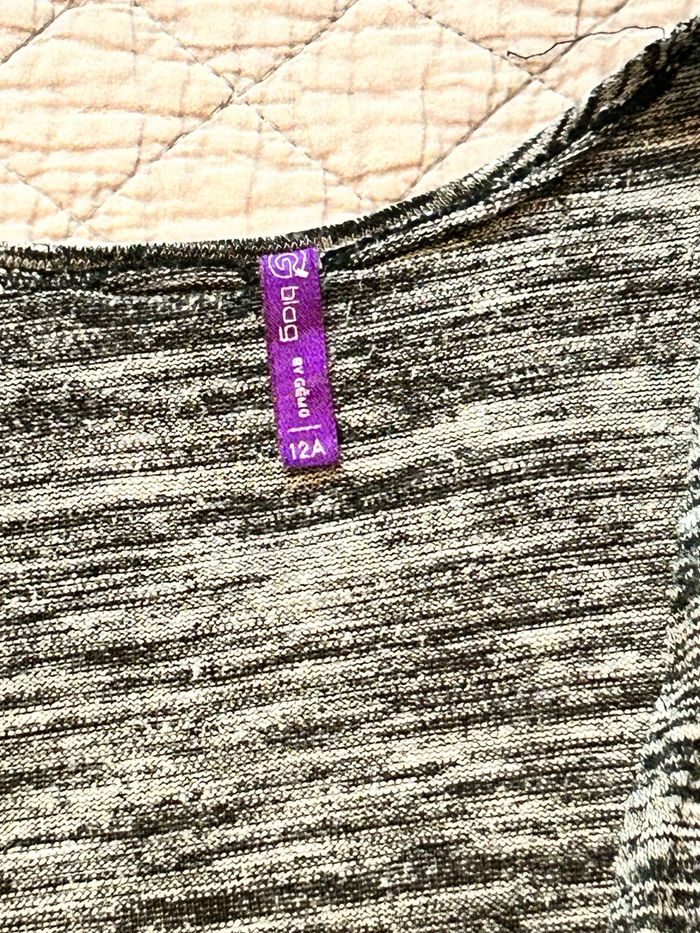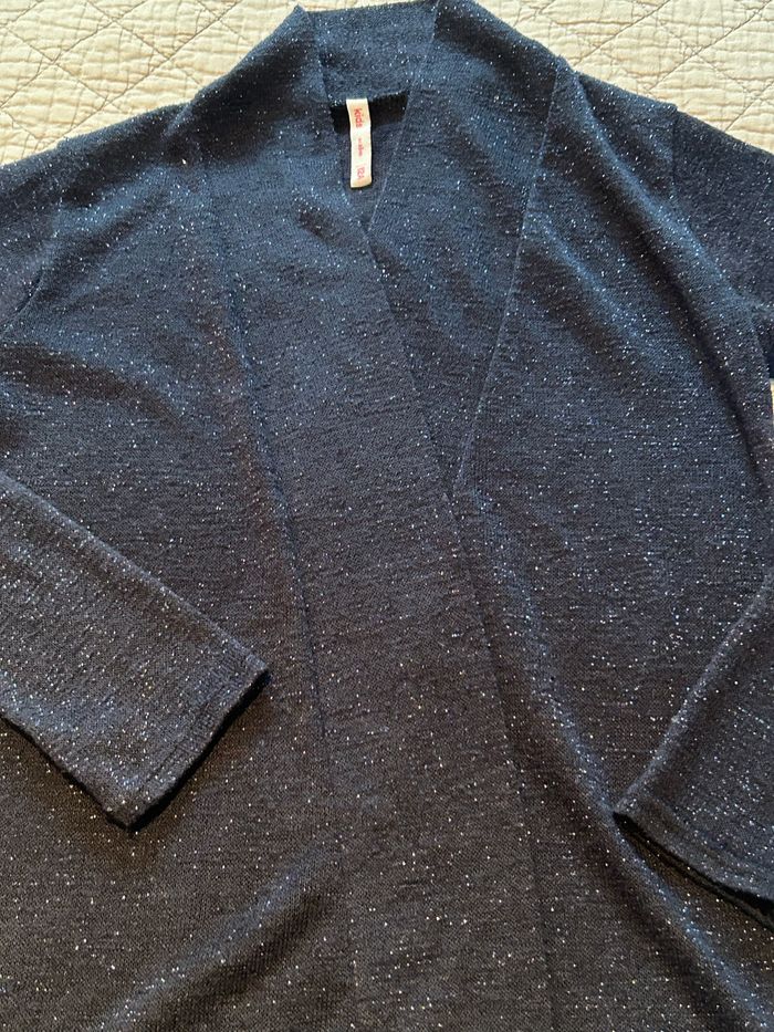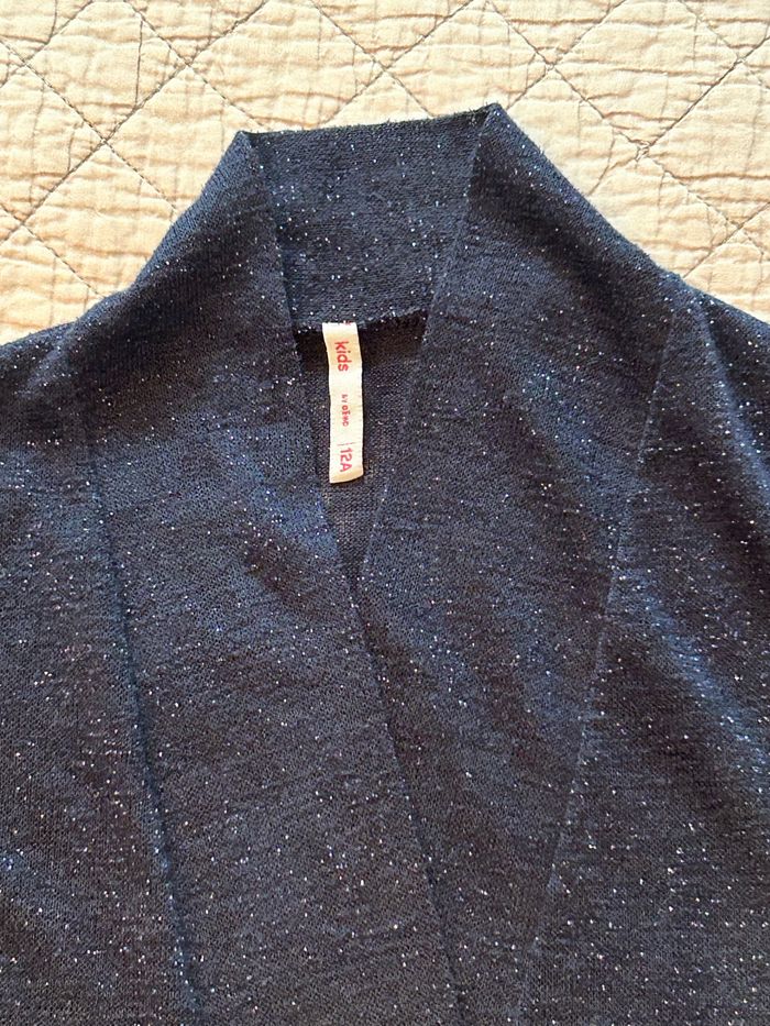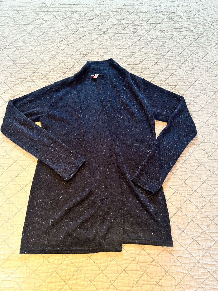 Lot de 2 gilets forme cardigan mi longs sans boutons. Taille 12 ans de la marque « Kids by Gemo ». -1 de couleur bleu marine pailleté argent. Forme évasée avec un jolie tombé. -1 gris chiné avec les manches noires. Forme très évasée pour celui-ci. En excellent état.