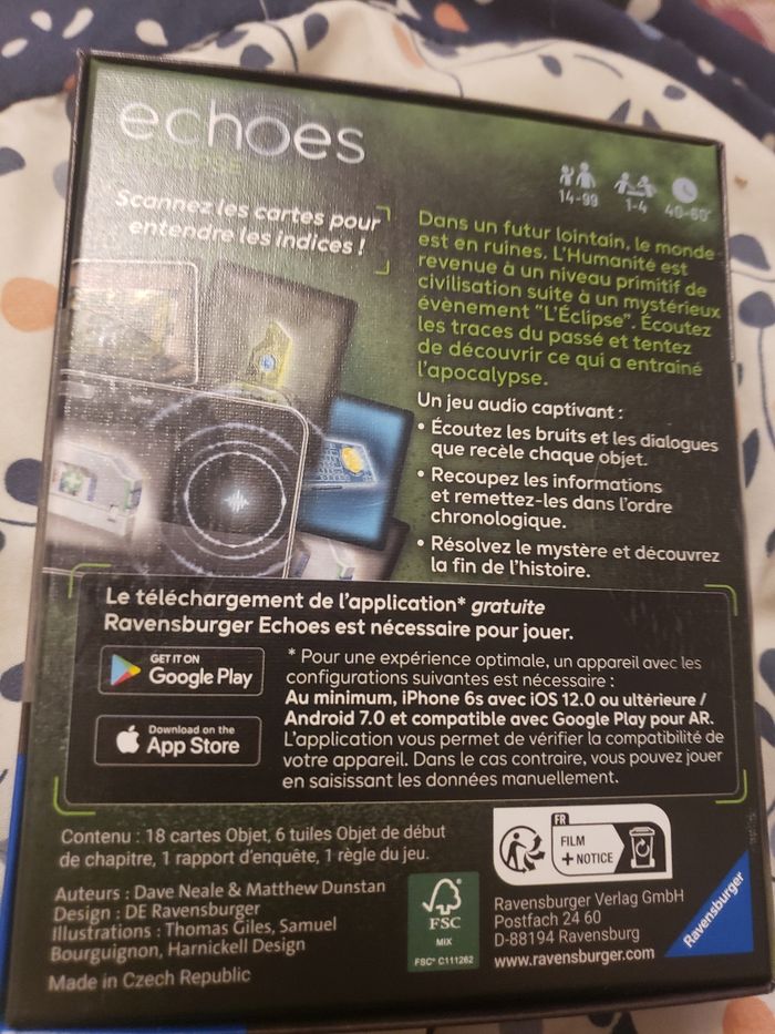 Neuf UNE EXPÉRIENCE IMMERSIVE UNIQUE : De mystérieuses disparitions intriguent les habitants d'un petit village dans l'Est de l'Europe. S'agirait-il d'un monstre sanguinaire ? Partez à sa poursuite et faites éclater la vérité. Préparez-vous à vivre une expérience émotionnelle intense d'environ 60 min ! Pour 1 à 4 joueurs à partir de 14 ans. JEU D'ENQUÊTE AUDIO : Dans Echoes, vous faites partie d'une équipe d'enquêteurs très particuliers. Vous avez le don de percevoir des bruits et des voix mystérieuses émanant des objets : les "échos du passé". Écoutez et trouvez les indices qui vous permettront de reconstituer la chronologie des événements. Parviendrez-vous à élucider le mystère ? SE JOUE AVEC UNE APPLI GRATUITE : Avant de jouer, téléchargez l'application gratuite Ravensburger Echoes sur iOS ou Androïd, puis sélectionner le titre "Le Croc" et laissez-vous guider. Au fur et à mesure que vous progressez dans l'histoire, de nouveaux sons se débloqueront. Si vous êtes bloqués, l’application vous donnera de précieux indices. FACILE D'ACCÈS : Quelques secondes d'explication suffisent pour commencer à jouer ! Une expérience ludique et immersive inédite qui séduira les adeptes de jeux d'enquête et d'escape game. Son format de boîte compact vous permettra de l'emporter facilement n'importe où. Idéal pour les soirées entre amis ou en famille. DÉJÀ 6 SCÉNARIOS DISPONIBLES : La Danseuse - Le Cocktail - L'Éclipse - L'Anneau - Le Violon - Le Croc. Chaque boîte contient 18 cartes Objets, 6 tuiles Objet de début de chapitre, 1 règle du jeu. Chaque scénario correspond à une expérience de jeu unique. Le matériel de jeu reste intact, vous pouvez donc le partager avec vos amis