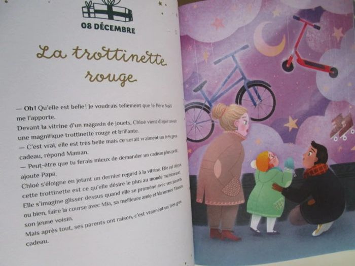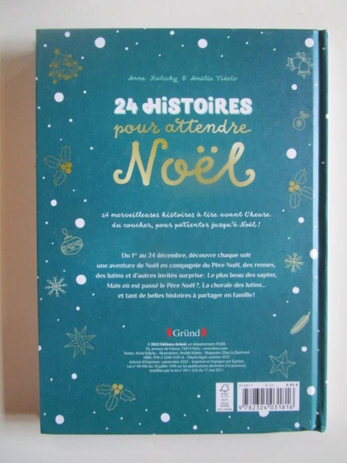 Un joli recueil avec une histoire par jour pour patienter en attendant Noël ! Du 1er au 24 décembre, une histoire de Noël à lire avant l'heure du coucher : Un invité surprise, Le plus beau des sapins, Mais où est passé le Père Noël ?,... et tant d'autres histoires à découvrir en famille ! Avec les textes tendres d'Anne Kalicky et les magnifiques illustrations d'Amélie Videlo. Éditeur ‏ : ‎ GRUND JEUNESSE 96 pages Âge de lecture ‏ : ‎ 4 - 8 ans Dimensions ‏ : ‎ 19.4 x 1.7 x 26.9 cm Livre en parfait état, comme neuf Je vends d'autres livres sur Noël #phil_peg_noel #noel