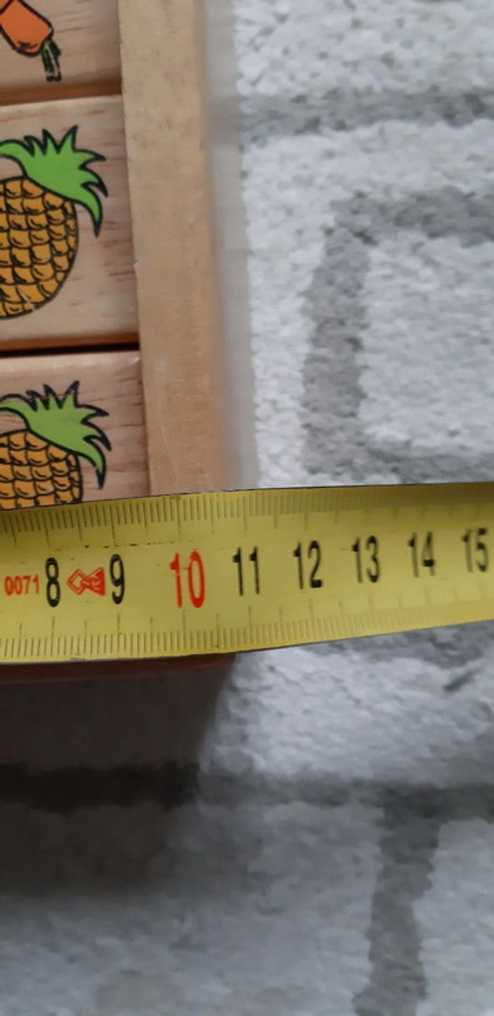 Jeu de dominos fruits légumes et boite en bois sans couvercle Ananas, orange, poivron, carotte, raisin, pastèque, fraise... 30 pièces Marque Janod Très bonne qualité, jeu durable. Traces d'usage mais en très bon état. N'hésitez pas à créer un lot pour profiter de réductions. Envoi possible ou peut être récupéré en main propre à Brionne (27) ou à Rouen (76) pour éviter les frais de port et d'acheteur.