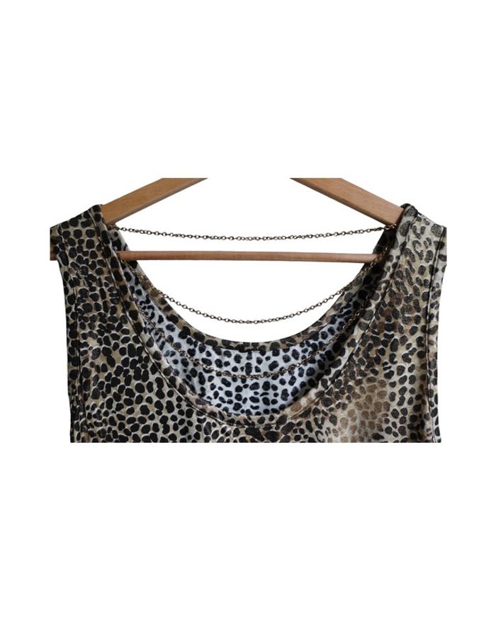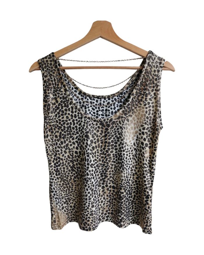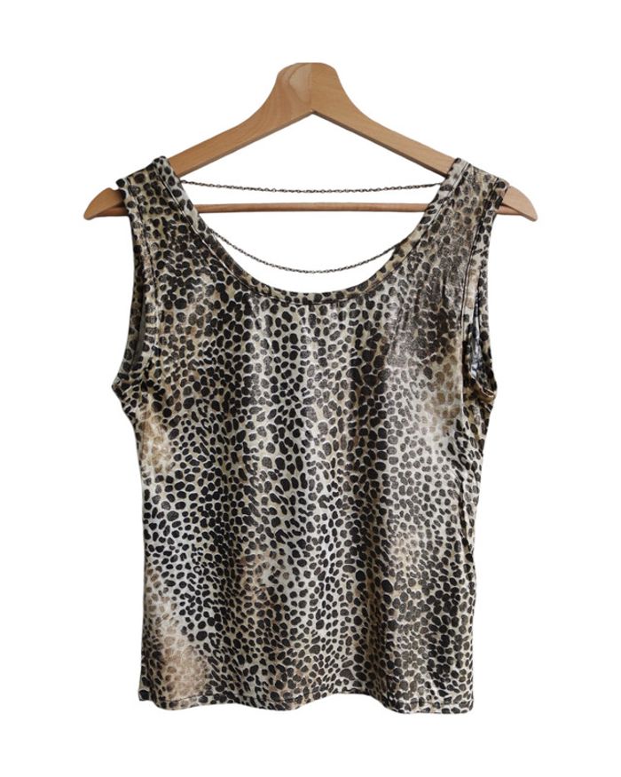 📃 description : Débardeur léopard un peu brillant avec chaine dans le dos pour un décolleté chic, nous avons la jupe et le cardigan qui forme un ensemble 🎨 couleur : noir, beige 🆗 état : parfait état 📏 taille : 36 🏁 motifs : leopard 🏷 composition : lycra
