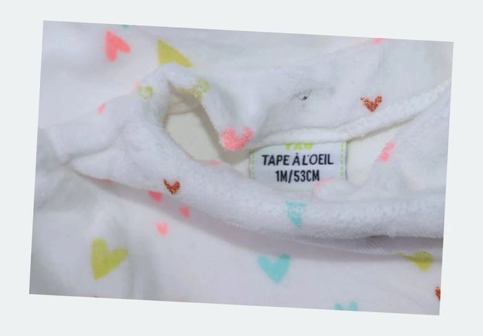 📃 description : pyjama attache a l avant, pyjama velours 🎨 couleur : blanc, multicolore 🆗 état : parfait état 📏 taille : 1 mois 🏁 motifs : coeur