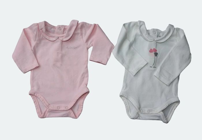📃 description : bodies manches longues bébé fille avec com claudine 🎨 couleur : rose, blanc 🆗 état : parfait état 📏 taille : 1 mois 🏁 motifs : uni, petit dessin trèfle coeur sur le body blanc