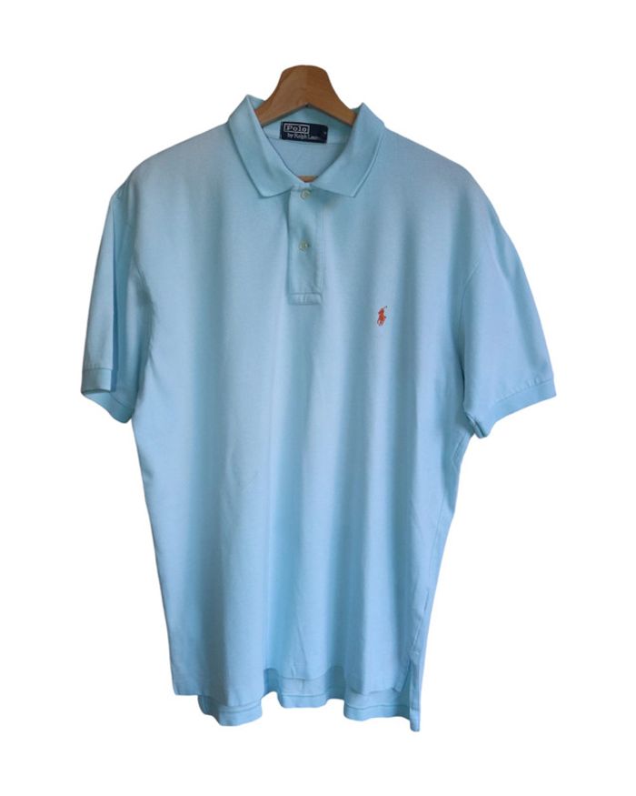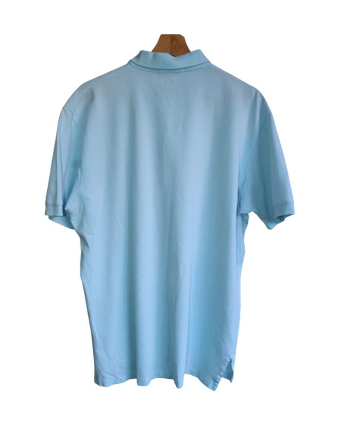 📃 description : Polo manches courtes 🎨 couleur : bleu ciel 🆗 état : parfait état 📏 taille : L 🏁 motifs : uni 🏷 composition : 100% coton