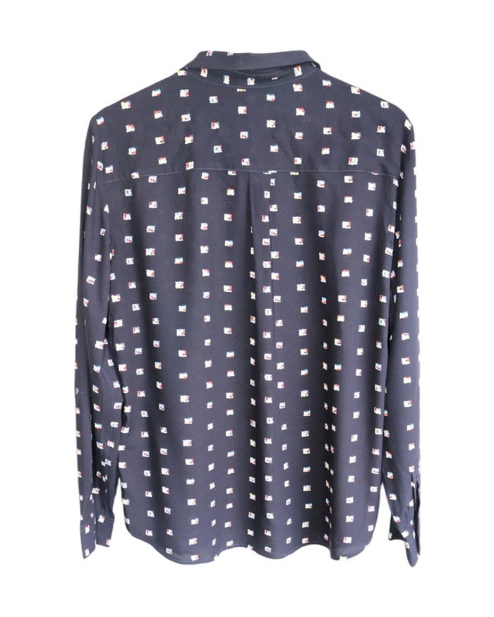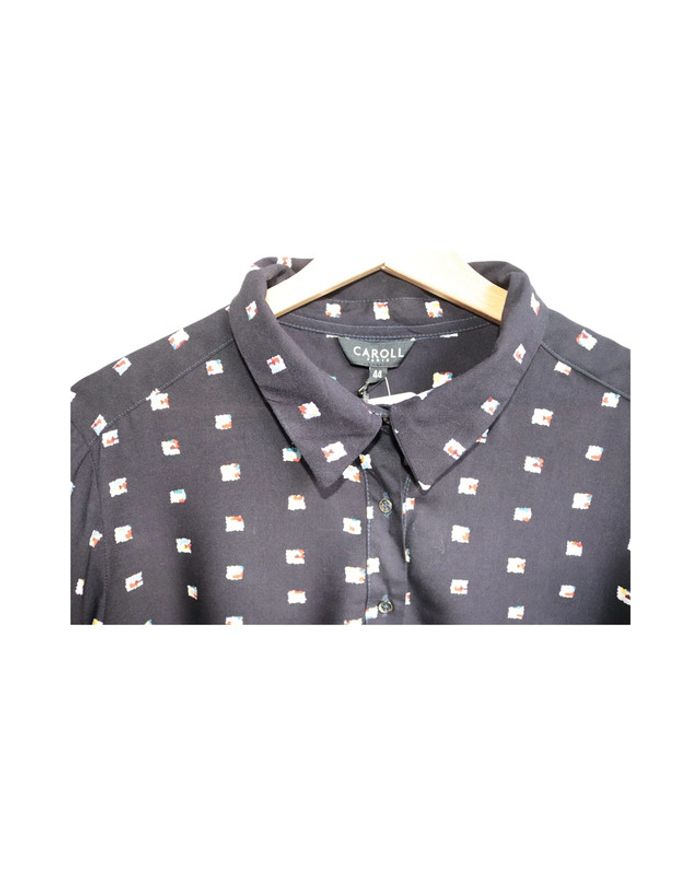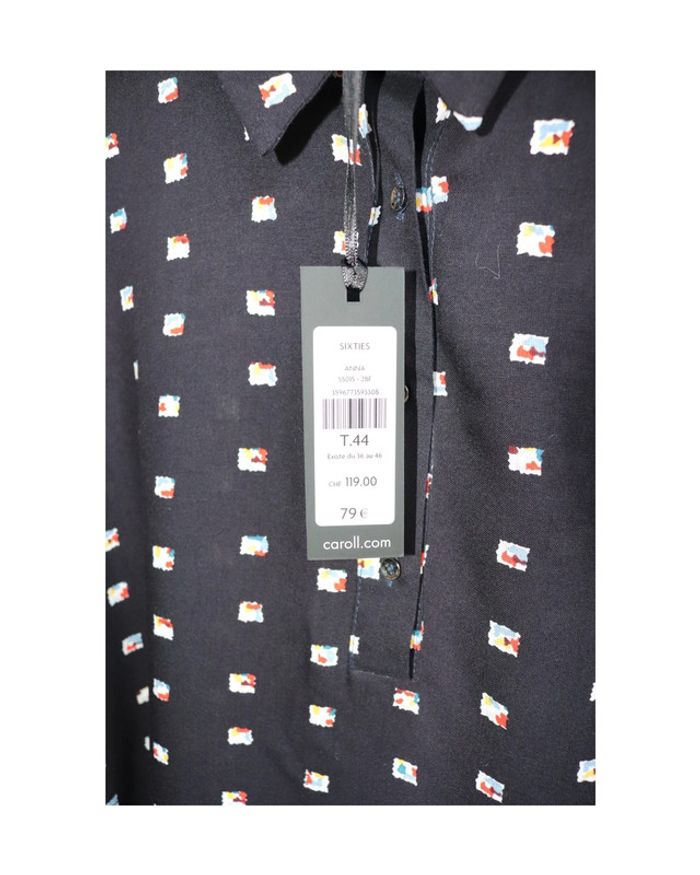 📃 description : Tr!s jolie blouse neuve de chez carroll 🎨 couleur : bleu marine 🆗 état : neuf avec étiquette 📏 taille : 44 🏁 motifs : avec motifs effet drapeaux