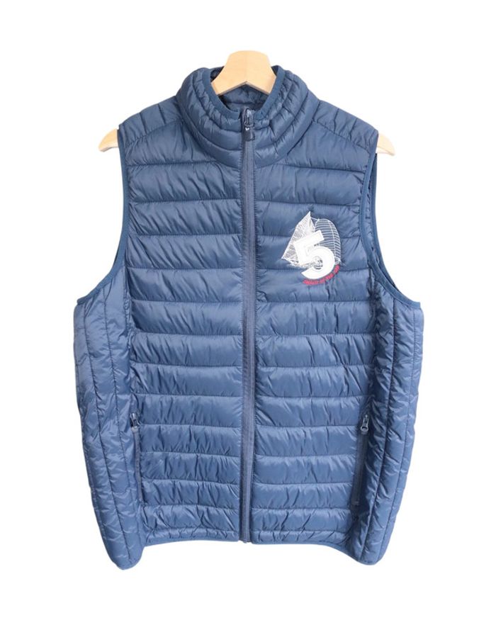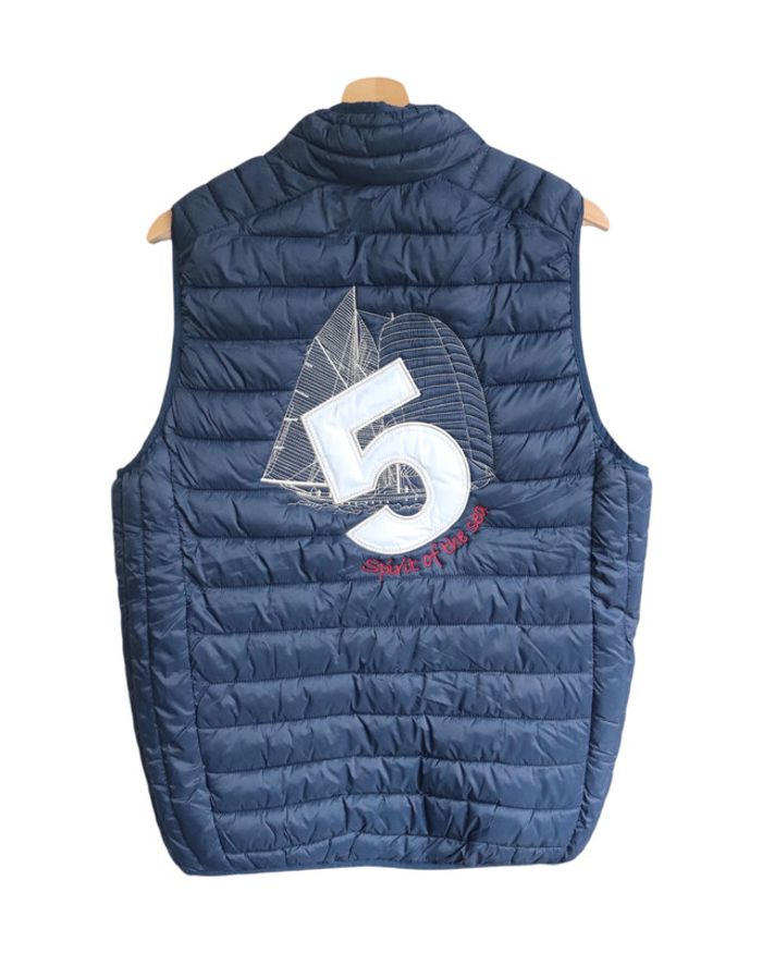 📃 description : Jolie doudoune sans manches avec broderies sur le thème du voilier à l'avant et dans le dos 🎨 couleur : bleu marine 🆗 état : parfait état 📏 taille : L 🏁 motifs : uni et broderies bateau 🏷 composition : polyamide, polyester