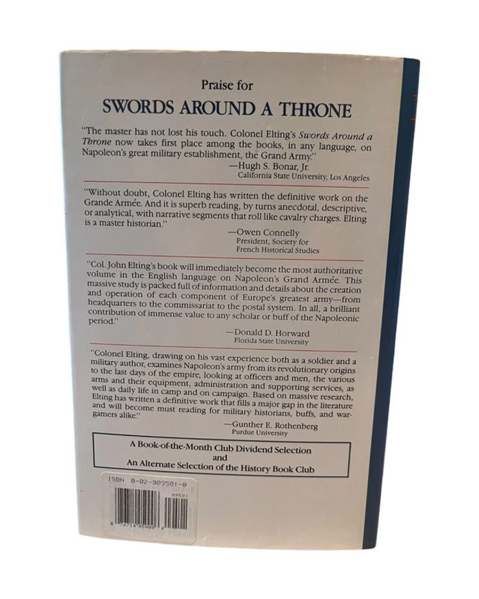 En parfait etat Swords around a Throne is a detailed book of Napoleon's Grande Armee from its inception to its destruction and after. Background material is provided of the Ancien Regime's Royal Army and the armies of the French Revolution as well as allies, foreign troops in French service and the Grande Armee's enemies. Generals, captains, and the man in the ranks are all quoted. The final chapters talk about the return, hasty departure, and final return of the Bourbons 'in the allies' baggage wagons', and what happened to the Grande Armée and its commanders after Napoleon's final exile.