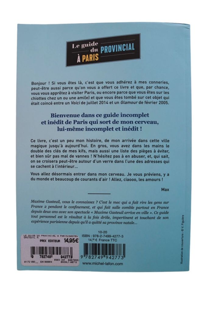 📃 description : Le guide du provincial à Paris Bonjour ! Si vous êtes là, c'est que vous adhérez à mes conneries, peut-être aussi parce qu'on vous a offert ce livre et que, par chance, vous vous apprêtez à visiter Paris, ou encore parce que vous êtes sur les chiottes chez un ou une ami(e) et que vous êtes tombé sur cet objet qui était coincé entre un Voici de juillet 2014 et un Glamour de février 2005. Bienvenue dans ce guide incomplet et inédit de Paris qui sort de mon cerveau, lui-même incomplet et inédit ! Ce livre, c'est un peu mon histoire, de mon arrivée dans cette ville magique jusqu'à aujourd'hui. En gros, vous avez dans les mains le double des clés de mes kifs, mais aussi une liste des pièges à éviter, et bien sûr pas mal de vannes ! N'hésitez pas à en abuser, et, qui sait, on se croisera peut-être autour d'un verre dans l'une des adresses qui se cachent à l'intérieur... Vous allez désormais entrer dans mon cerveau. Je vous préviens, y a du monde et beaucoup de courants d'air ! Allez, ciaooo, les amours ! Max