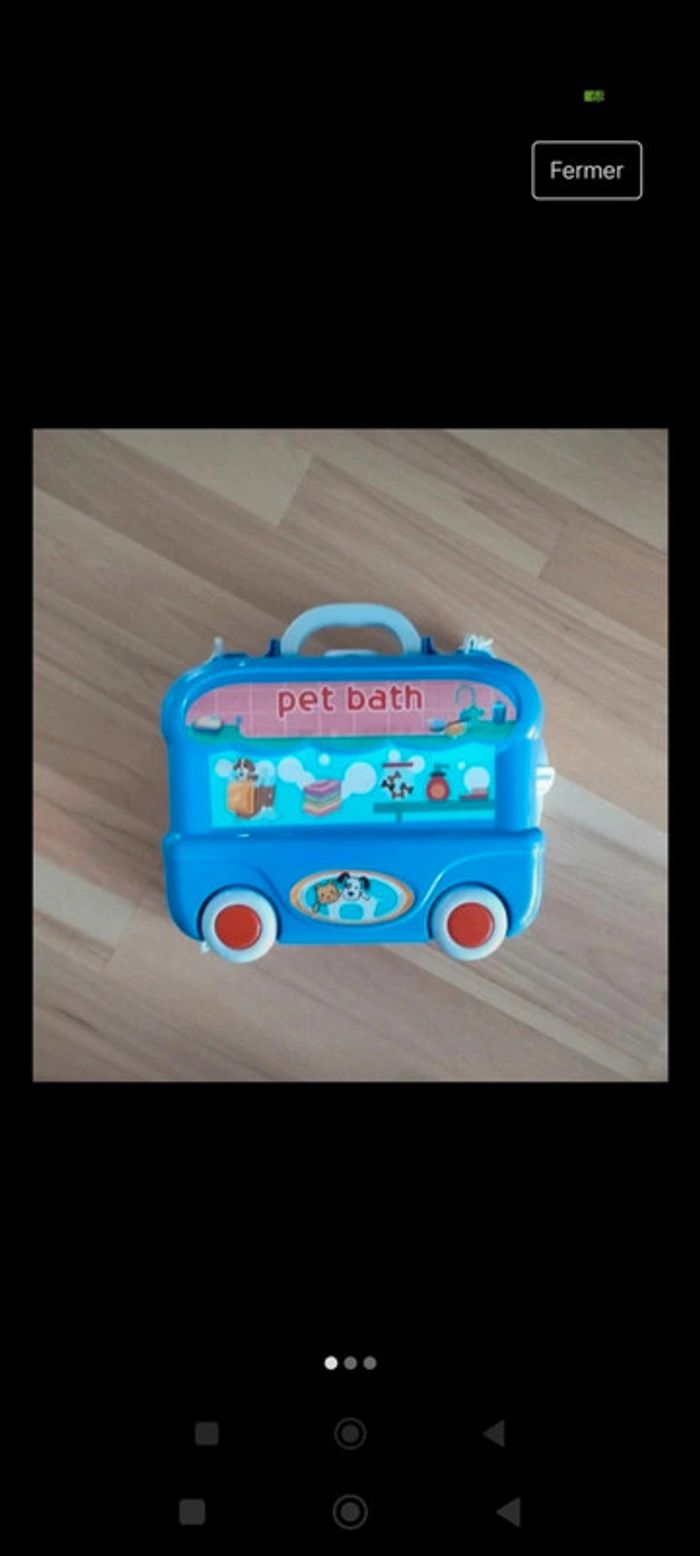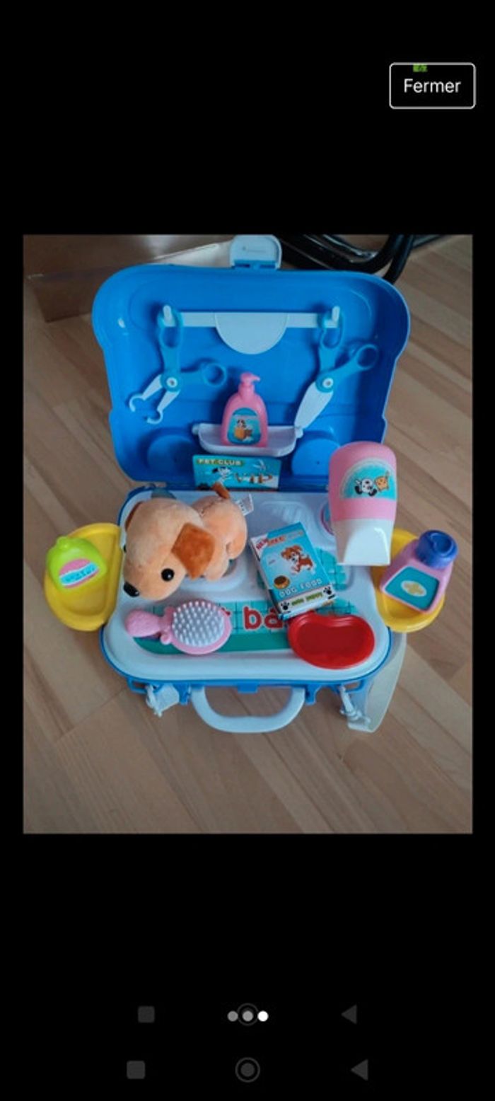 Mallette de toilettage : avec chien en peluche. Installe ta tablette de toilettage pour prendre soin de ton chien grâce aux accessoires fournis : sèche-cheveux, ciseaux, brosse .. La mallette roule ou se porte sur le dos. Dès 3 ans.
