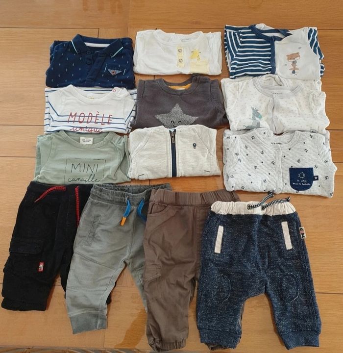 Lot de vêtements 3 mois comprenant : - 4 pantalons - 3 T-shirts manches longues - 1 polo manches courtes - 1 pull - 1 sweat à capuche - 3 pyjamas ouverture devant En très bon état #3moisgarcon #lotvetementsgarçon