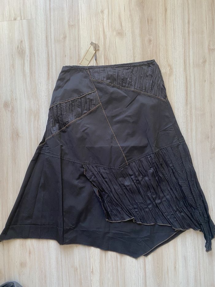 Jupe mi longue noire taille 40, forme évasée. Volants fantaisies devant et dos. Entièrement doublée 100% polyester. Neuve avec étiquette. Longueur 80cm, tour de ceinture 82cm. Matière : 50% coton 50% polyester.