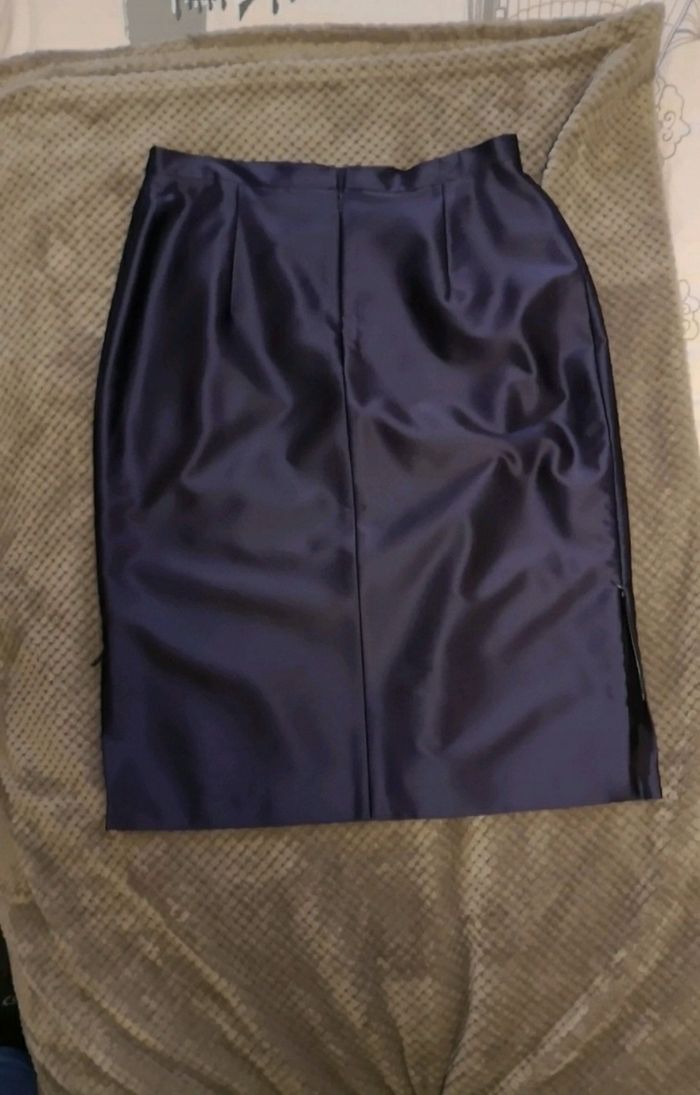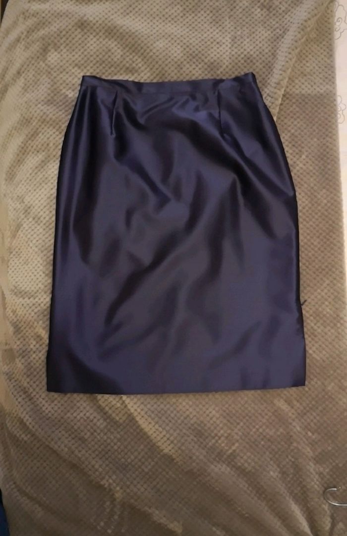 Tailleur satiné violet foncé. Jupe+veste à épaulettes. Porté une fois donc en parfait état. Marque René Hazan. Marque française Taille 40