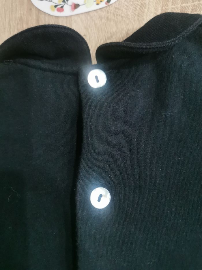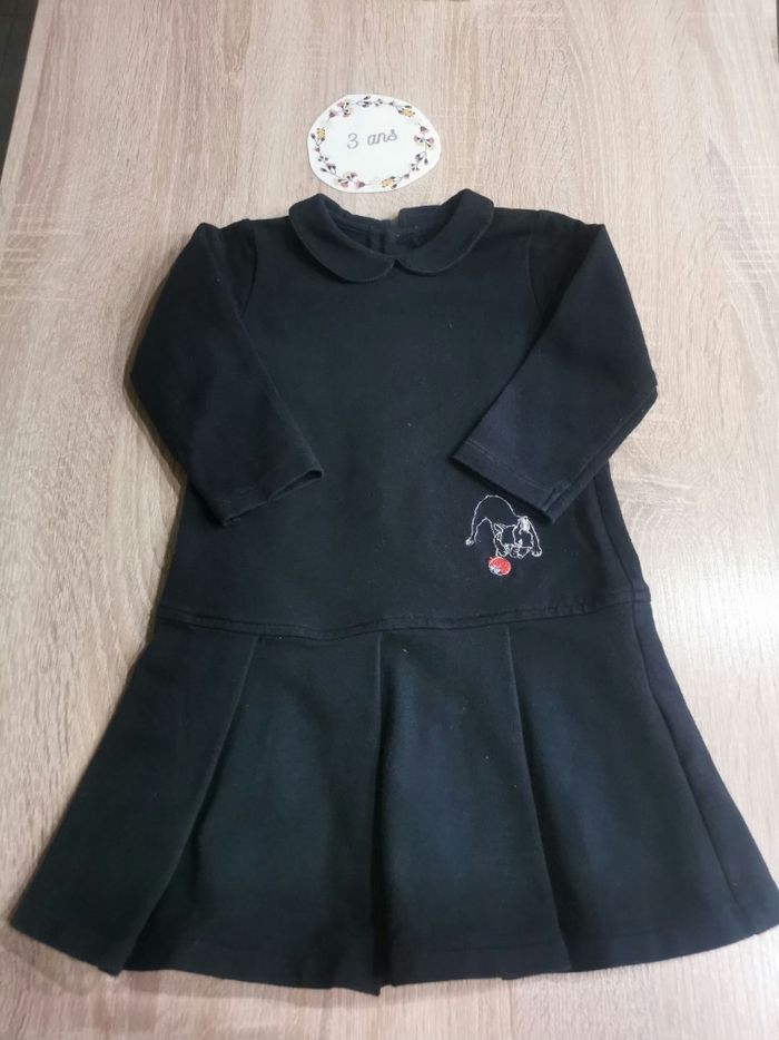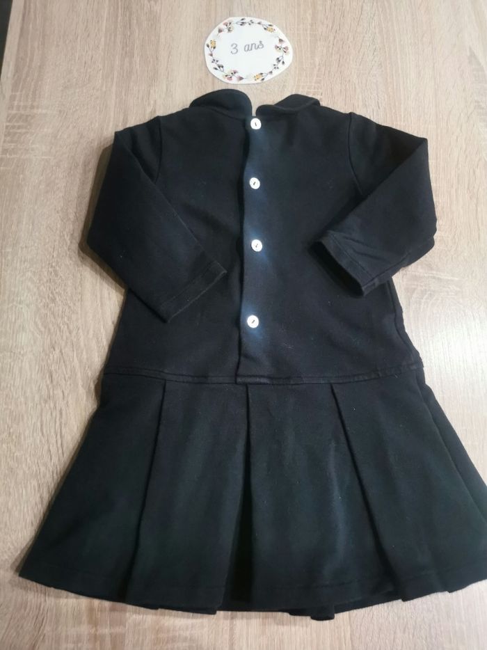 Robe noire manche longue en coton epais en taille 3ans. Je ne connais pas la marque. Elle est en très bon état, il y a encore le bouton de rechange sur l'étiquette.