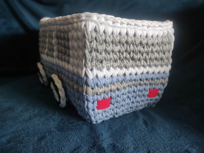 Coffre a jouets fond en bois 30*15 cm fait au crochet avec du tissu recyclé