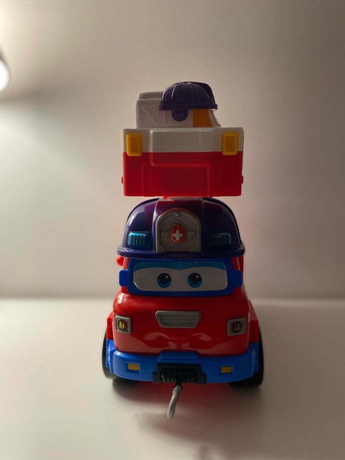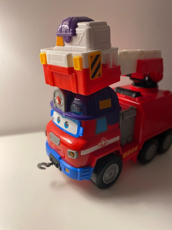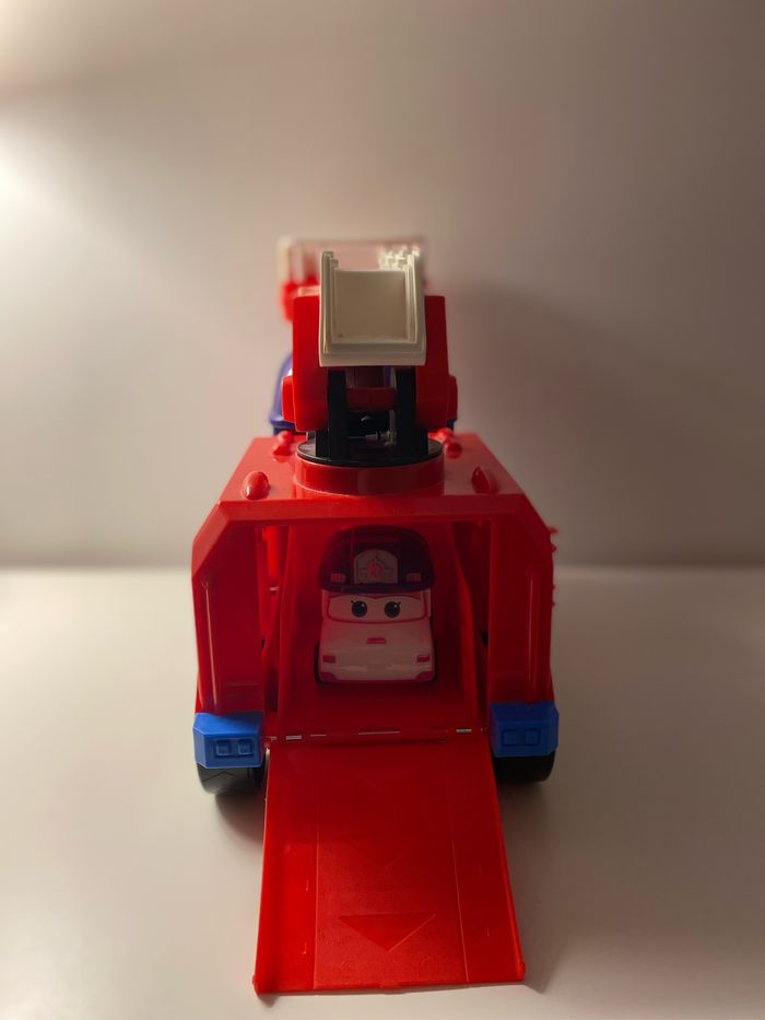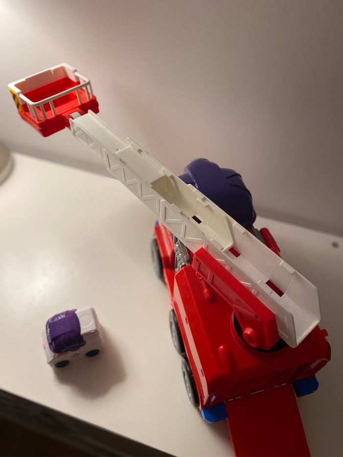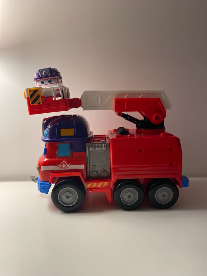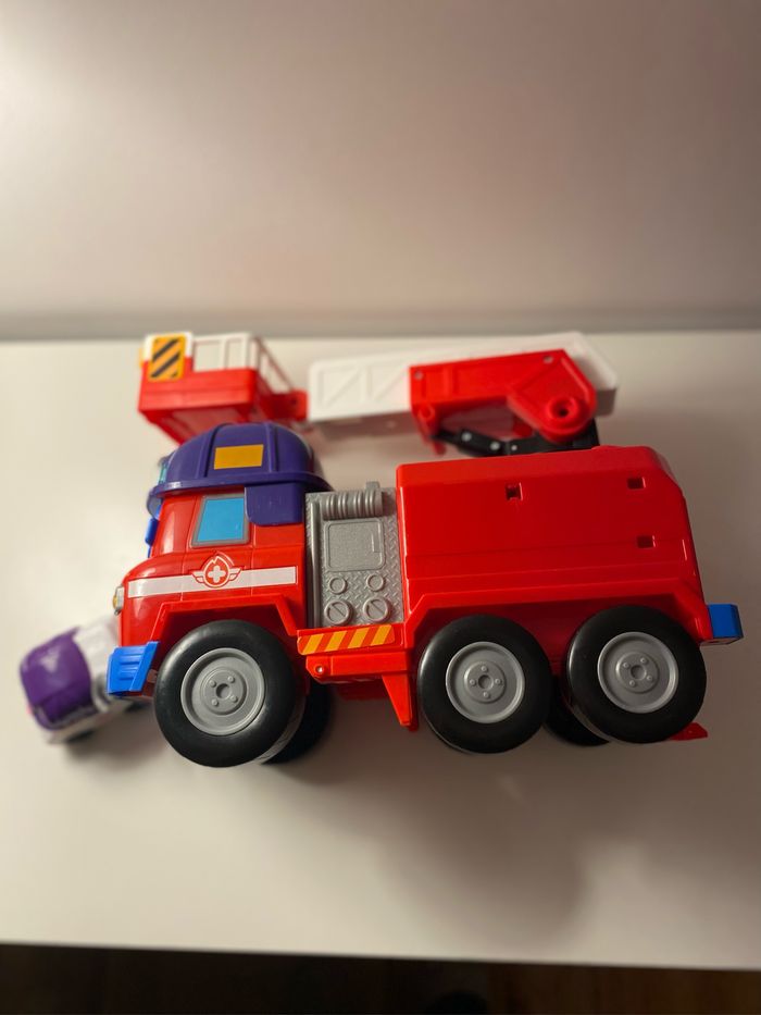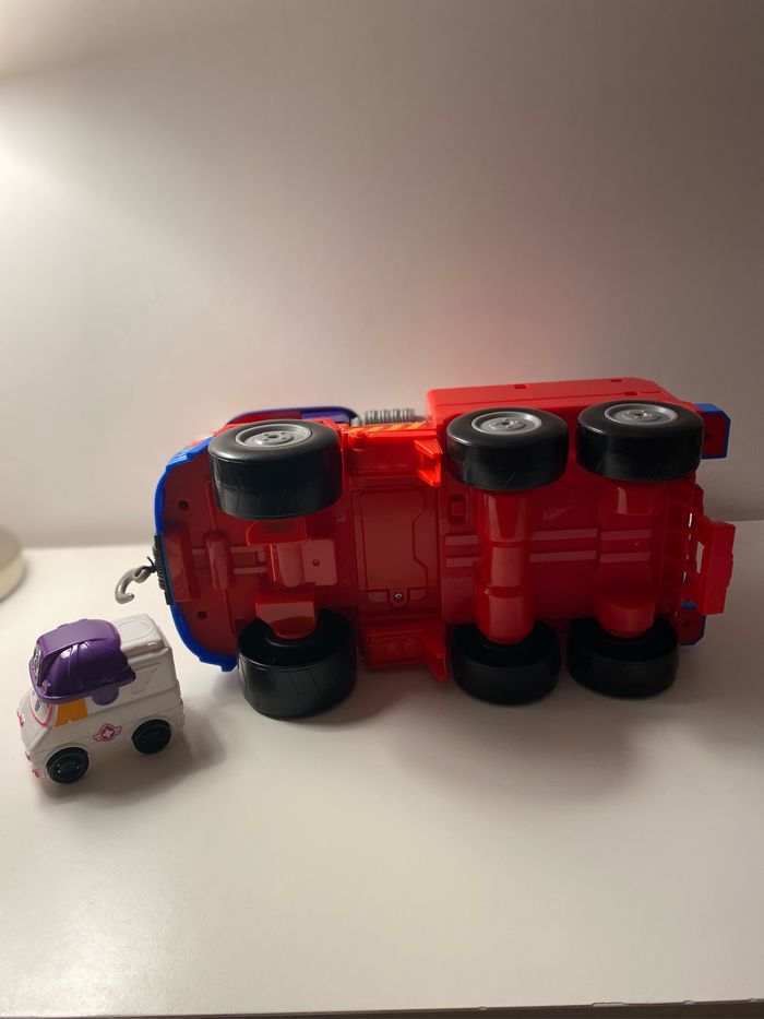 Camion de pompier + petite voiture de secours en très bon état. Effets sonores et lumineux. Fonctionne avec 3 piles AAA. Longueur du camion 28 cm.