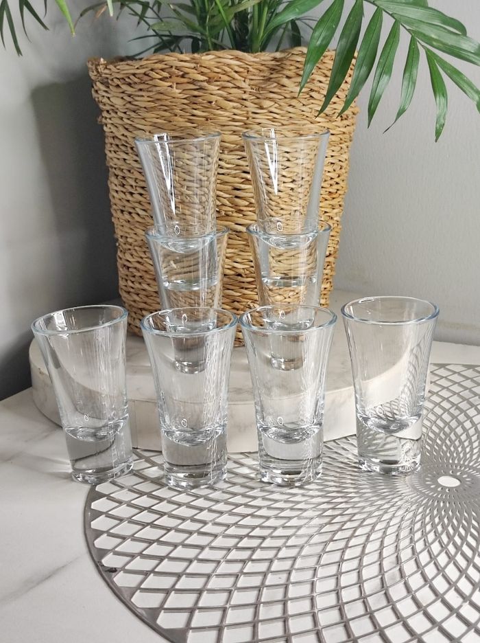 Lot de 8 petits verres à shooter, jamais utiliser. Dimensions Hauteur 8,8cm Diamètre 5cm. En très bon état
