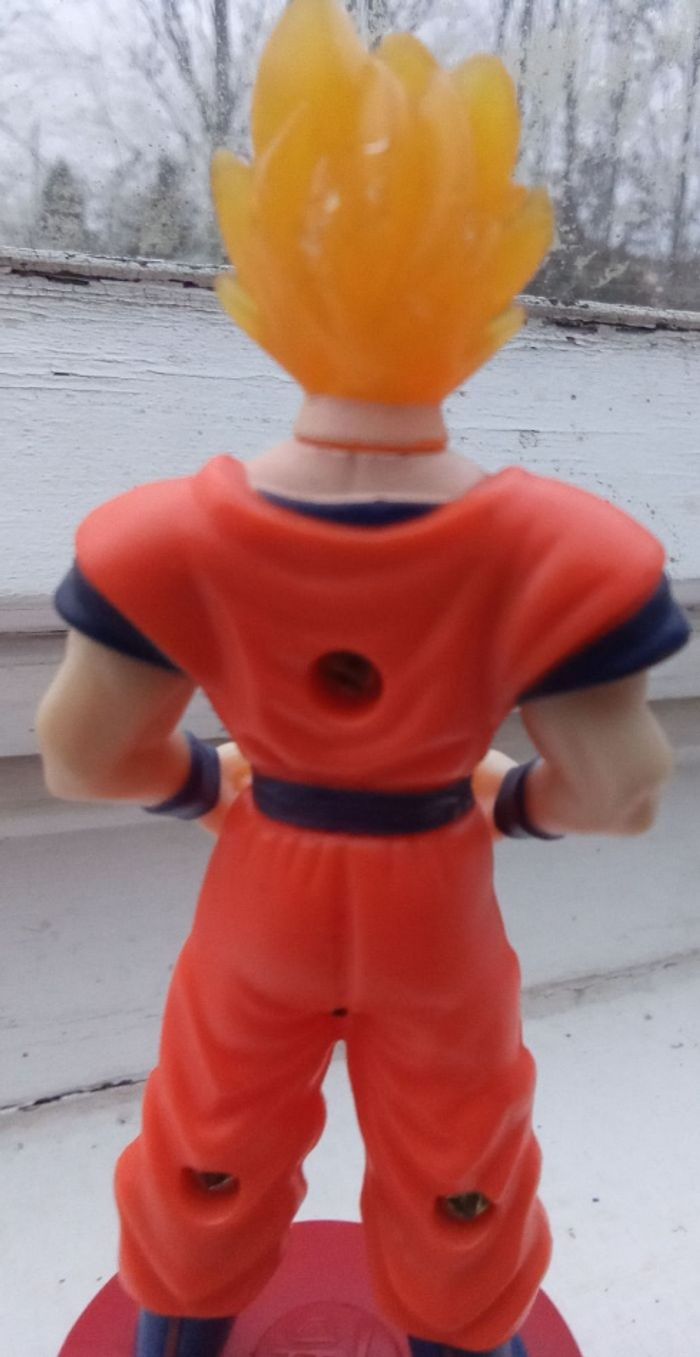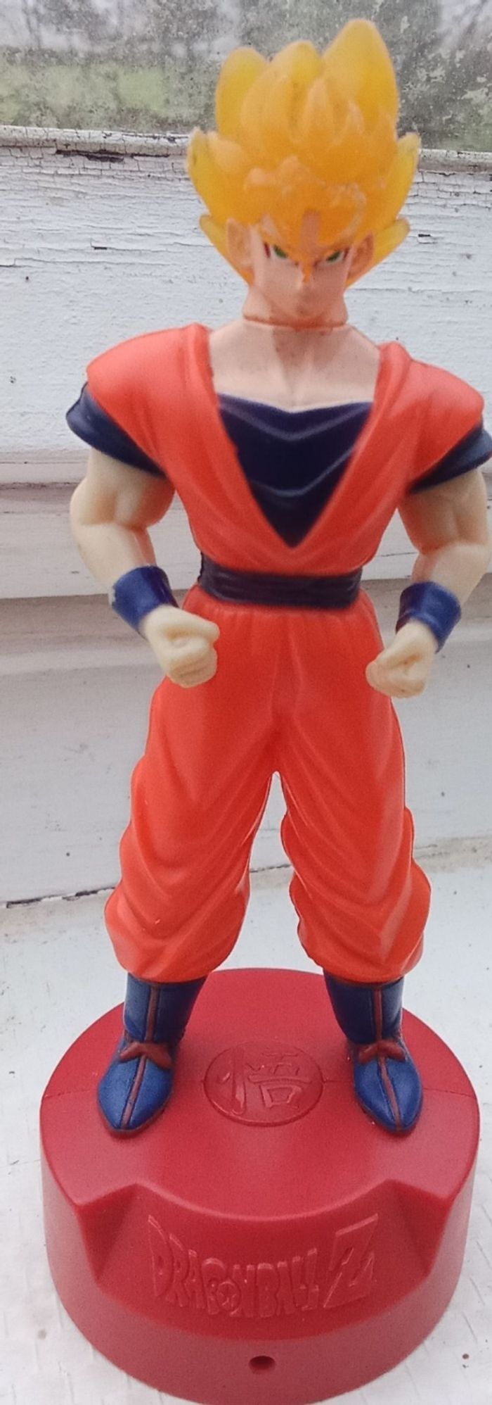 Figurine représentant un personnage de Dragon ball z, offert par mac do, ancienne collection , il faut que je vérifie la date sur la dernière photo). la lumière fonctionne parfaitement et diffuse une lumière saccadée sur la tête du personnage. Environ 14 cm du socle aux cheveux . Utilisé, montre des traces d'utilisation mais bon état général et de fonctionnement. D'autres articles dragon ball z comme cartes collection et manga également à vendre ds mon dressing et réduction
