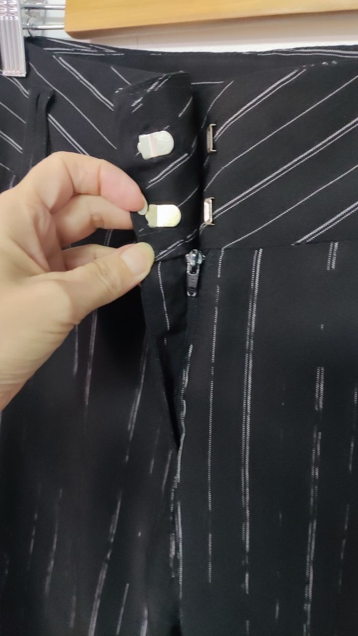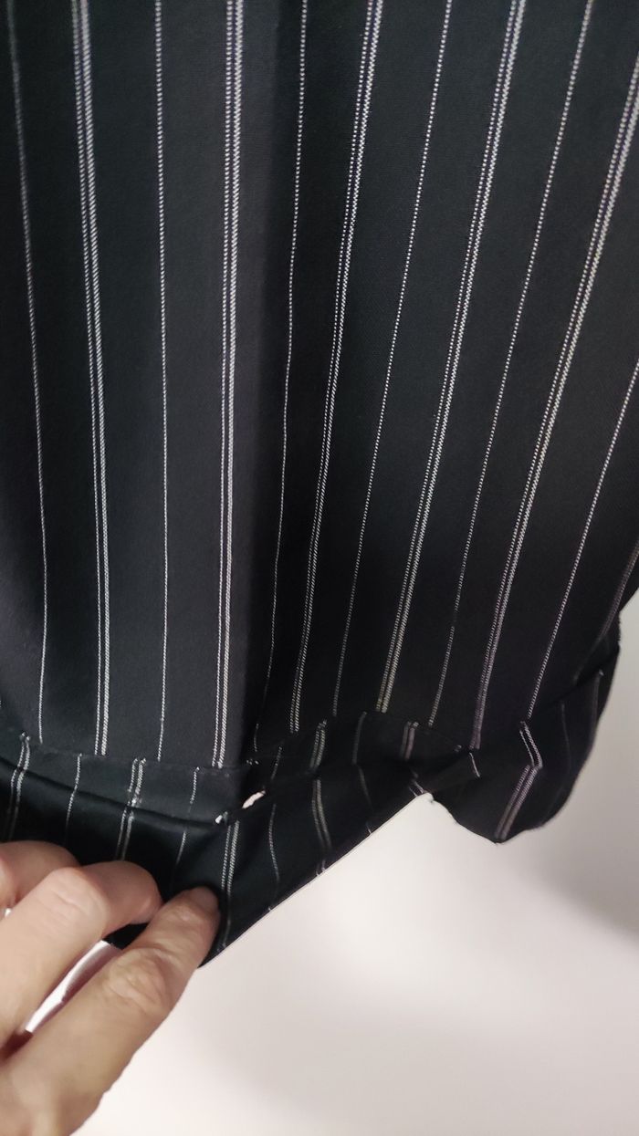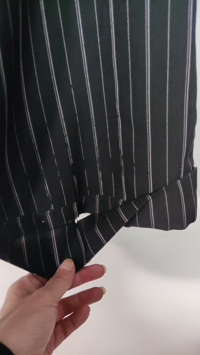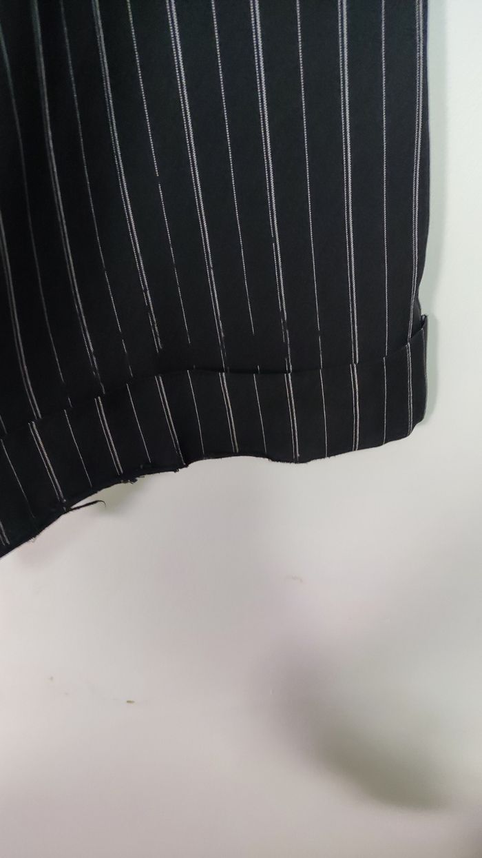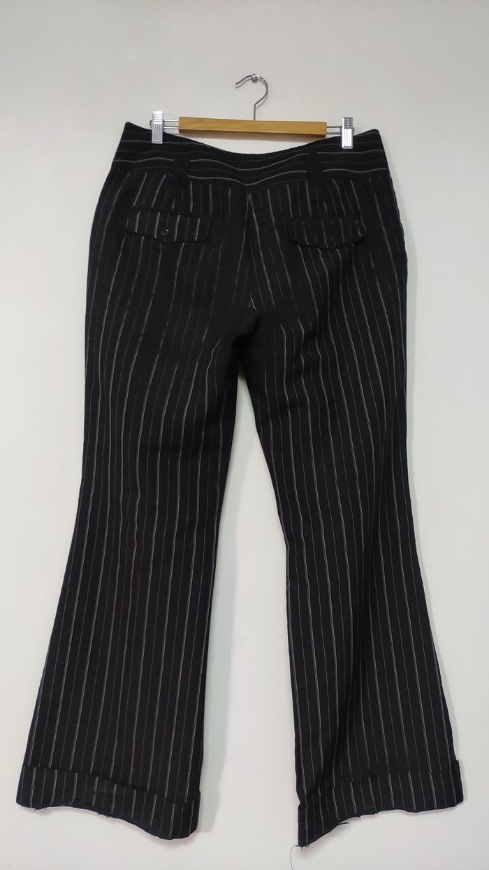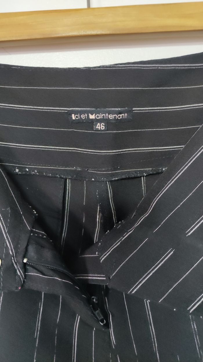 Pantalon à rayures 4 poches Taille 46 Polyester Marque Ici et maintenant Porté plusieurs fois Montre des imperfections Rayures qui s'estompe, Craqué sous les plis un point de couture à faire de chaques côté.