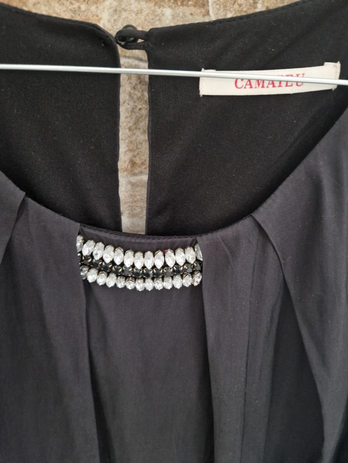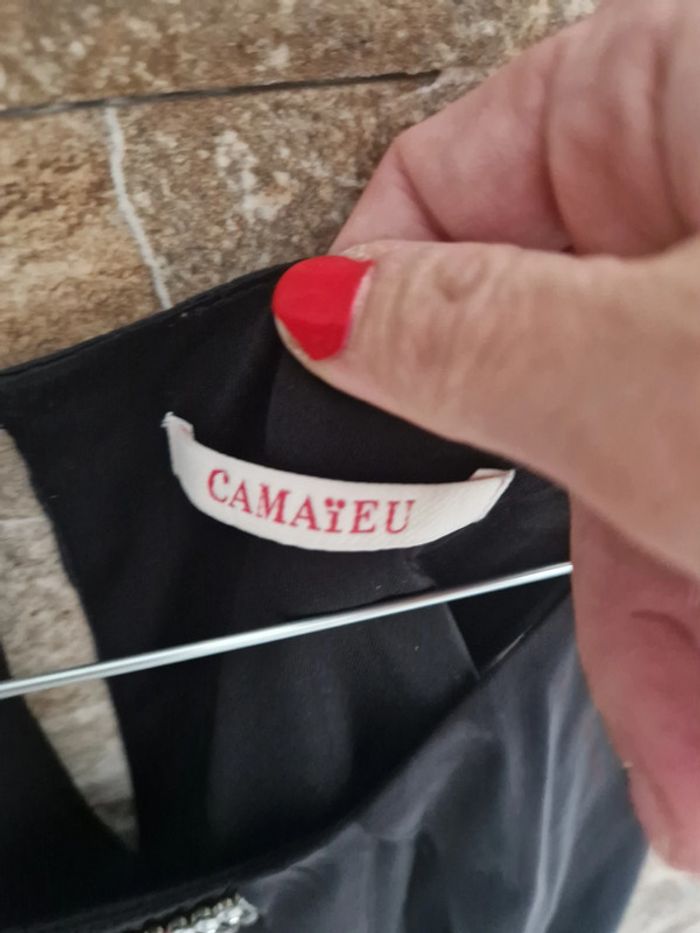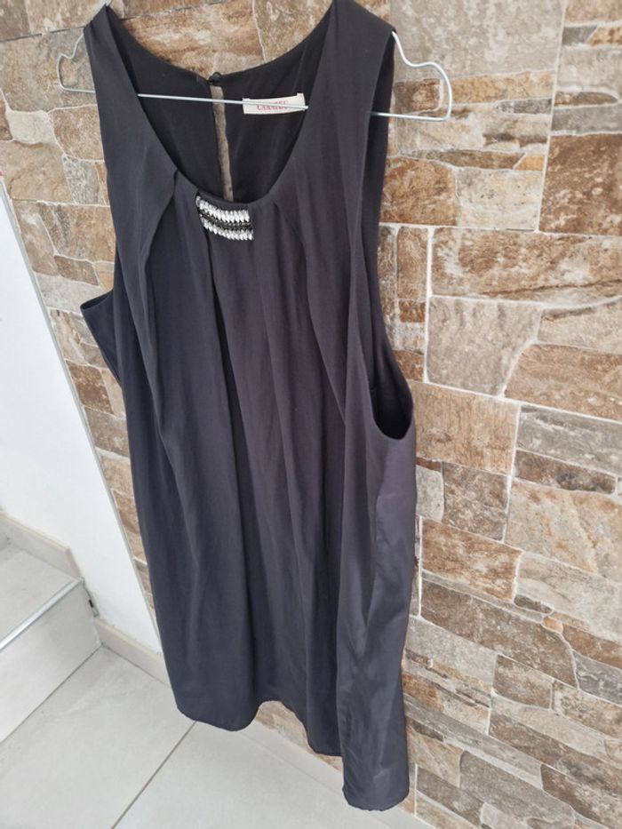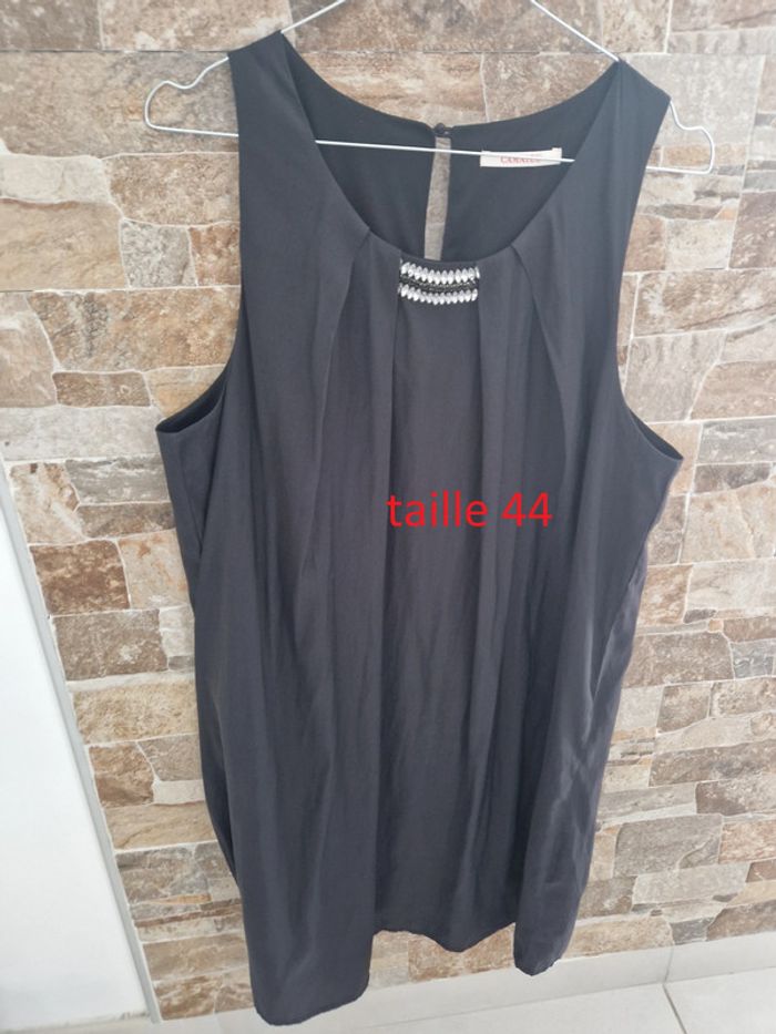 1 robe noir fluide doublé perles taille 44 marque camaieu 1 bouton en haut ds le dos perles devant haut du cou 86cm haut bretelles jusqu'en bas env. 54cm de large aisselle aisselle env. 64 cm env. aisselles jusqu'en bas #laetie69_femmesTAILLE44