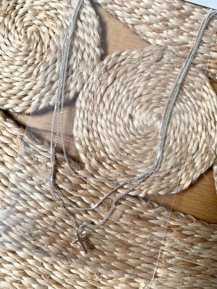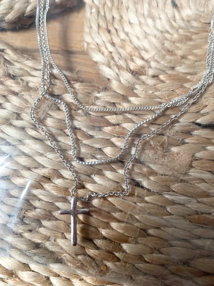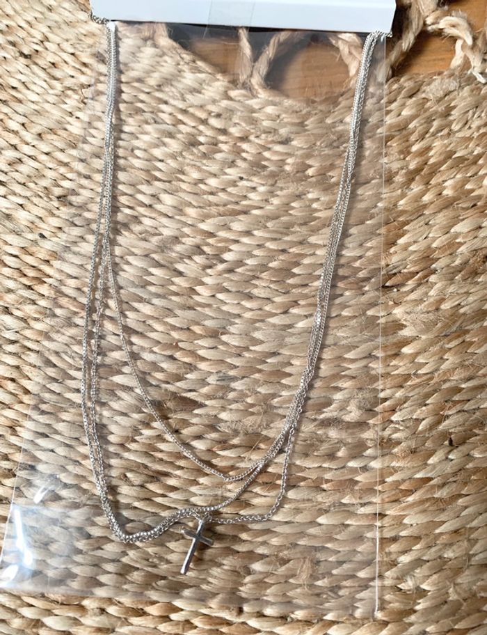 Collier religieux en acier inoxydable argent Triple chaînes 1 fermoir Neuf
