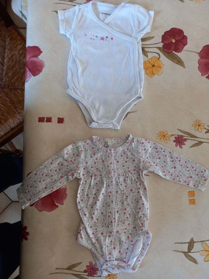 Lots de 2 bodys 3mois 60cm, ouverture par l'avant. Un body pull manche longues et un manches courte avec une légère trace dans Le dos. (Voir photo)