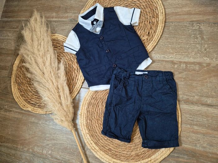 #audette80_garçon12mois Short mis une fois bleu marine Le reste est neuf Nœud intégrer à la chemise blanche Boléro bleu marine Couleur blanc et bleu marine 12 mois