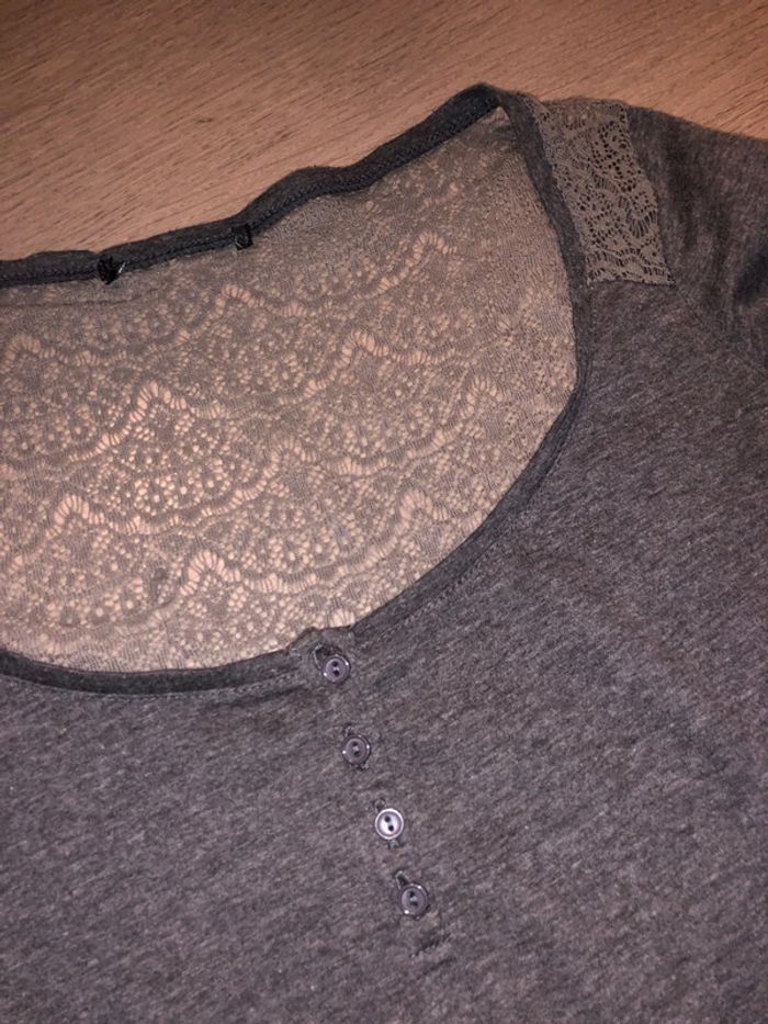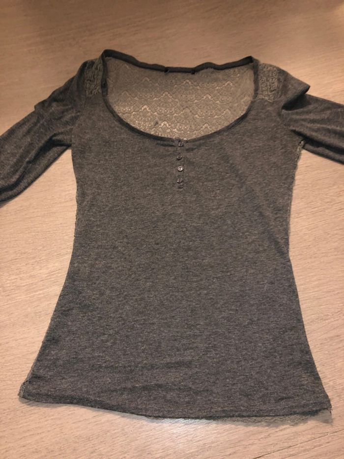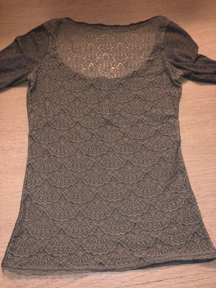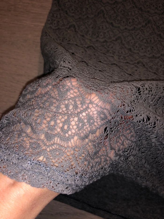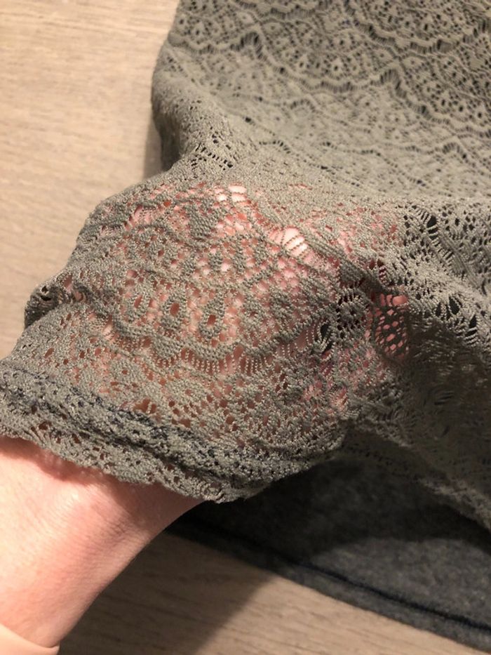 Gris avec dos en dentelle un peu kaki, semi transparent Étiquette coupée, mais Acheté à Naf-Naf taille 36