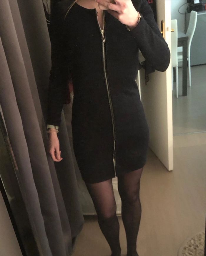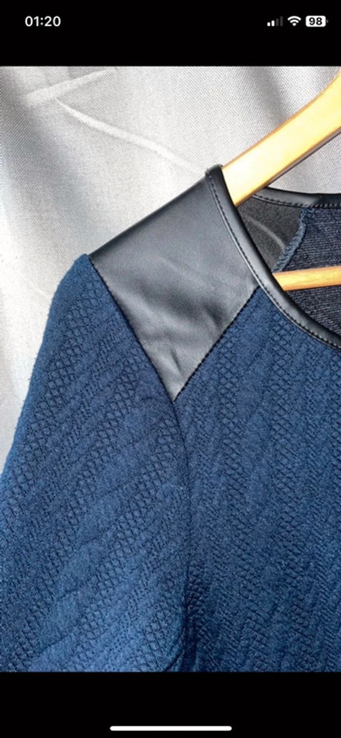 Bleu marine manches longues plutôt automne/hiver Ceintrée La fermeture s’ouvre totalement Simili cuir noir aux épaules