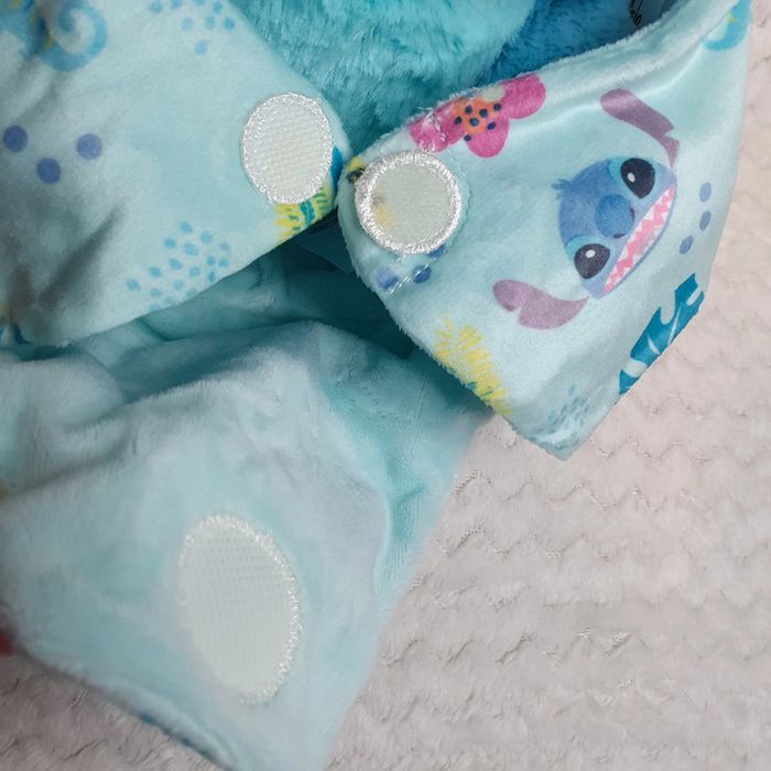 Peluche Stitch bleu pastel kawaii baby Lilo & Stitch (2002) visage brodé, tissu duveteux, touffe de cheveux, oreilles tombantes, lange amovible et réversible en velours avec motif tropical imprimé, fermeture à scratch 🌸✨️ neuf avec étiquette dans son emballage jamais servi