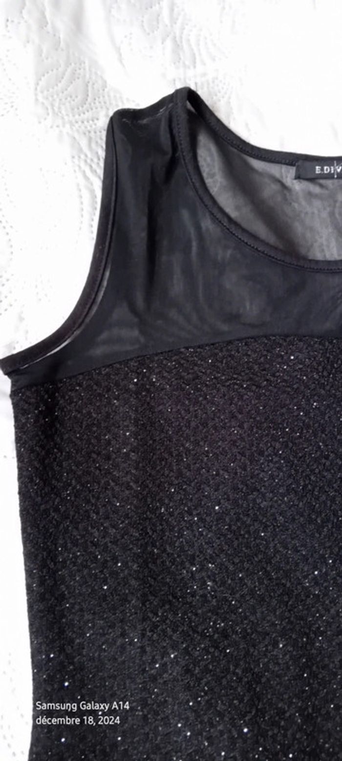 Robe débardeur longue bi matière en polyester et elastanne voile en haut tissus aspect gaufré en bas paillettes argentées scintillantes longueur 87 cm largeur aisselles à aisselles 43 cm taille L/XL correspond à un PETIT 40 idéale pour une soirée ou les fêtes de fin d'année jamais portée état neuf #midole #midolefemme #midolefemme40 #robefemmeL #robefemme40 #robedesoiree40 #robechic #robeapaillettes #robedefetes #e.diva #femme40