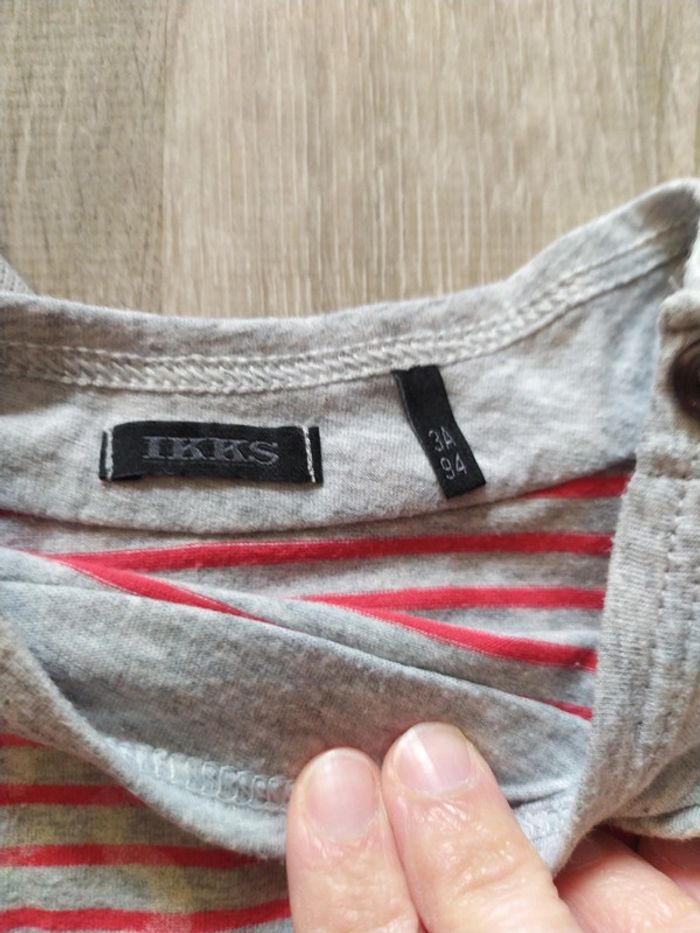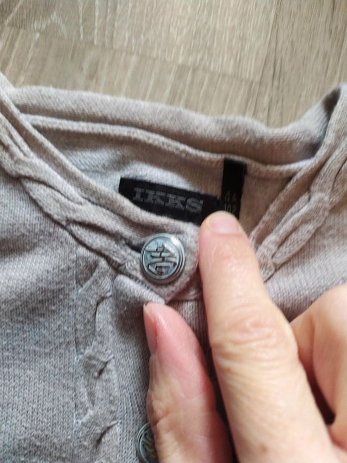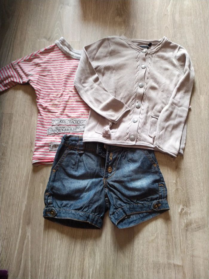 Gilet fin gris IKKS, brodé, pompon à chaque poche, boutons métal effet vieilli, en très bon état hormis un point de couture ( voir photo) Tee-shirt manches longues IKKS, étiquette indiquant 3 ans mais taille grand en très bon état Short jean fin en très bon état