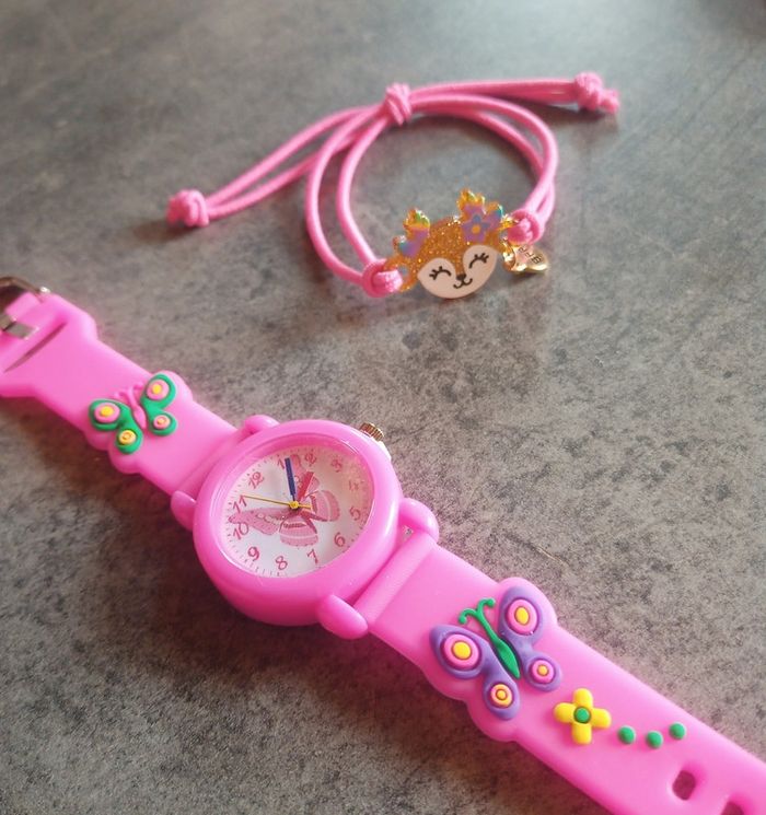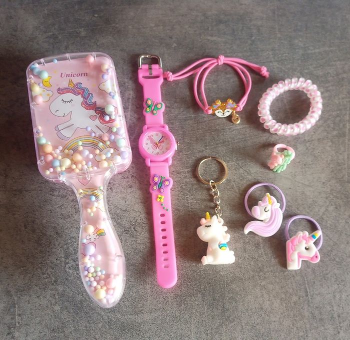 Idées cadeaux de Noël❤️ Ensemble Neuf 🦄 🦋 1 Montre papillon 🦋 1 Brosse Licorne 🦄 2 élastique Licorne 🦄 1 porte clé Licorne 🦄 2 bracelets licorne 🦄 1 bague réglable Le touts Neuf et emballé ! Prix: 17€ Disponible immédiatement Envoie rapide et soigné Profitez de remise sur l'achat d'un lot