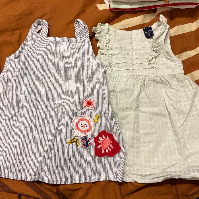 - 3 pyjamas une pièce - 3 gilets - 1 ensemble - 3 teeshirts - 5 bodies - 3 shorts - 1 short en jean - 2 robes manches courtes - 1 robe manches longues