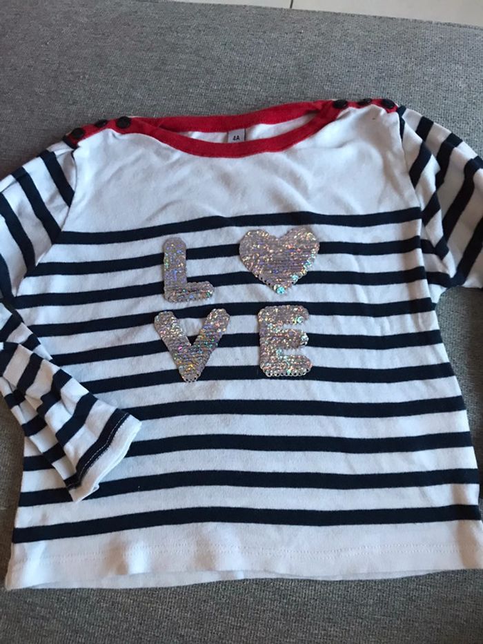 tee shirt manches longues 4 ans marinière love avec sequins rouge et argentées #4ansfillechoupi59300