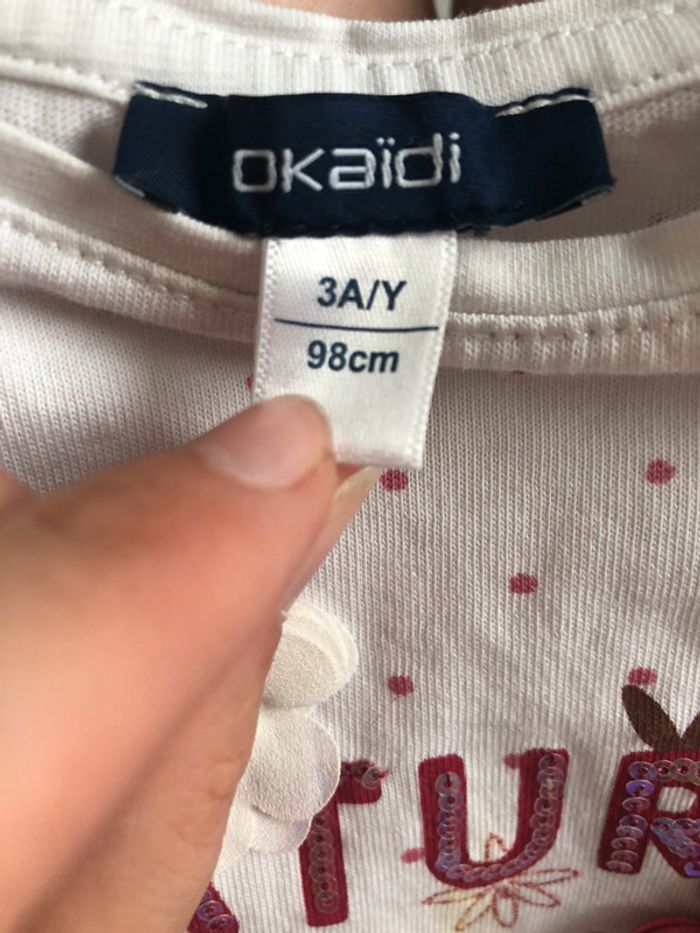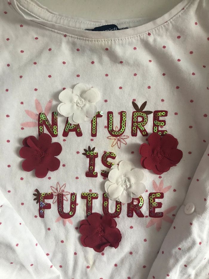 tee shirt manches longues très joli avec fleurs fantaisie très légèrement jauni dans le motif de la fleur en dessous du U du mot nature très peu porté okaidi motif à pois et fleurs en relief fantaisie nature is future 3 ans #3ansfillechoupi59300