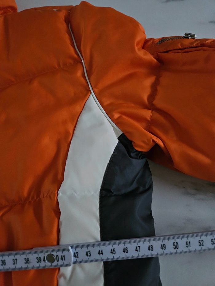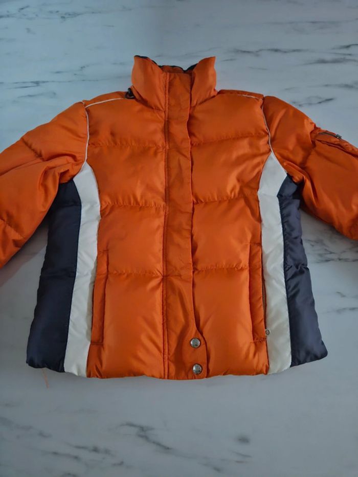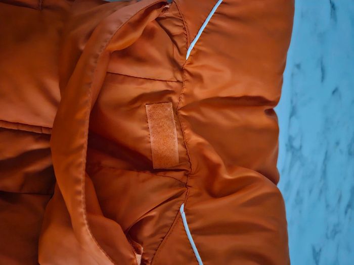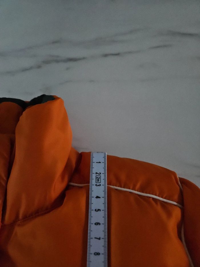 Prenez le temps de vérifier les mesures car mon mari qui fait un M y est à l'étroit. Elle est en état impeccable! Elle revient du nettoyage Elle tient chaud et elle possède une capuche dans le col. Le orange est moins flash que sur le mannequin plus comme la doudoune à plat