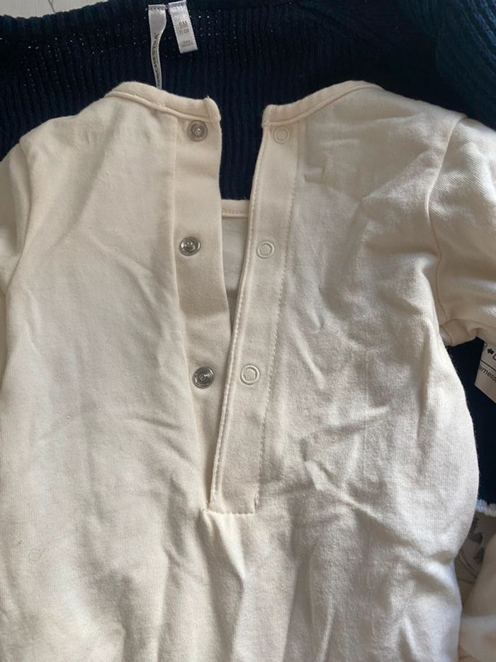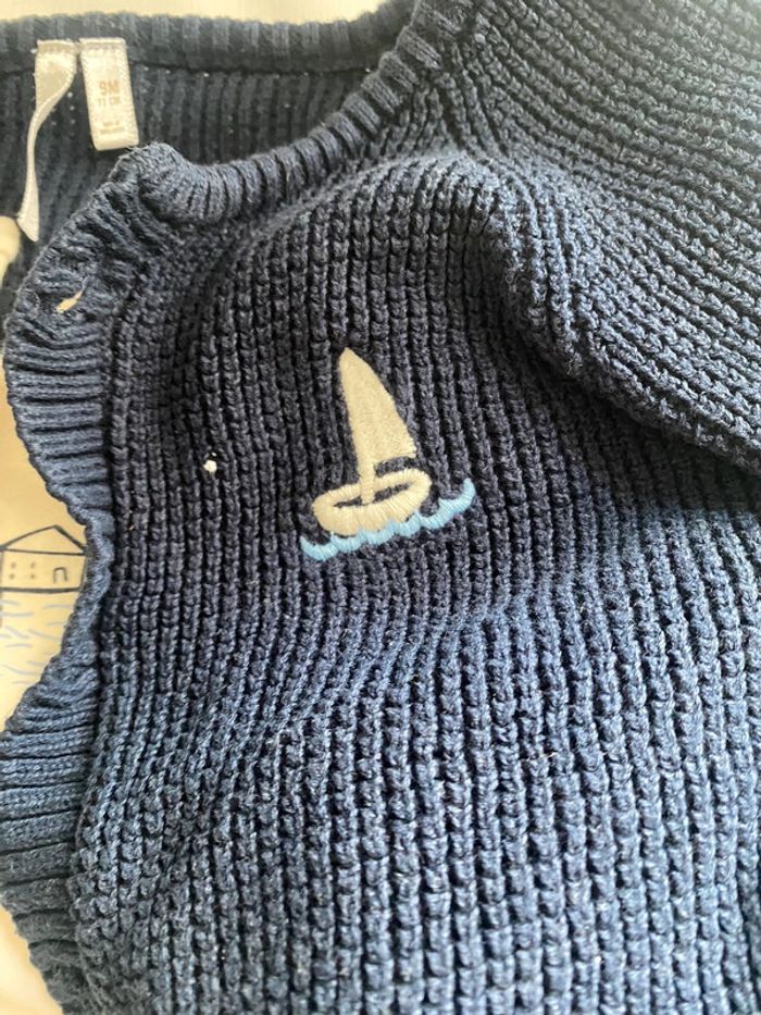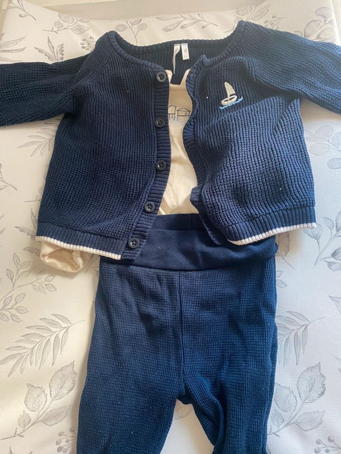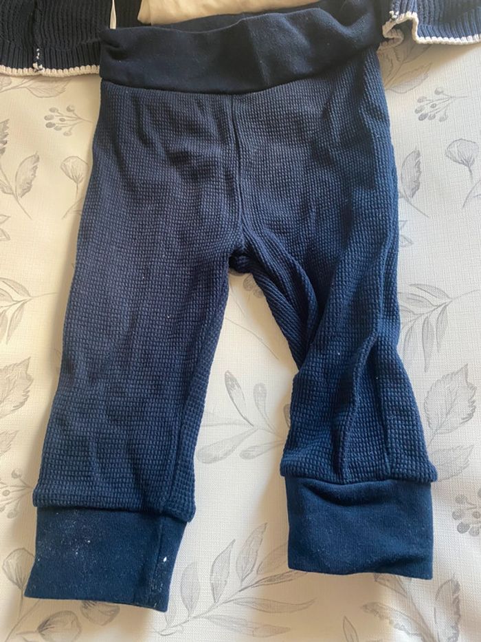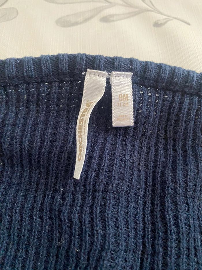 Ensemble orchestra 3 pièces comprenant : Un body Un gilet Un pantalon/leggings (Il y a également un bonnet si je le retrouve je le mettrais) Esprit marin, petit bateau En très bon état porté qu’une seule fois Le body est neuf 9 mois Pour plus de renseignements n’hésitez pas, pensez à faire des lots