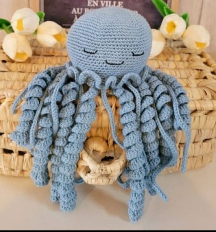 Pieuvre tête bleu ciel et les tentacules saumon/beige/vert