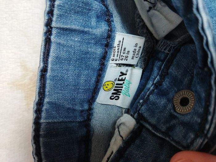 Jean 6 mois marque Smiley avec écussons et motifs sur le devant. Taille réglable.
