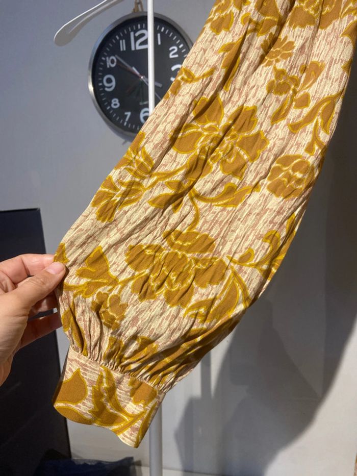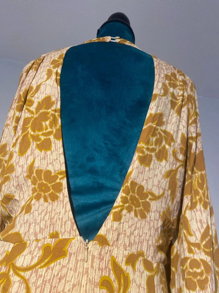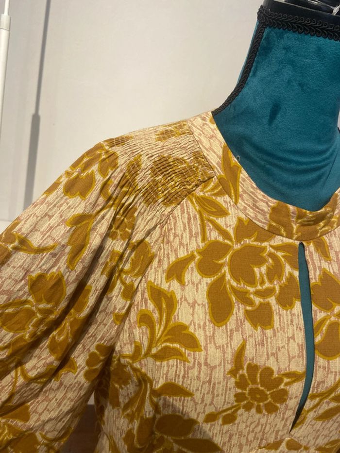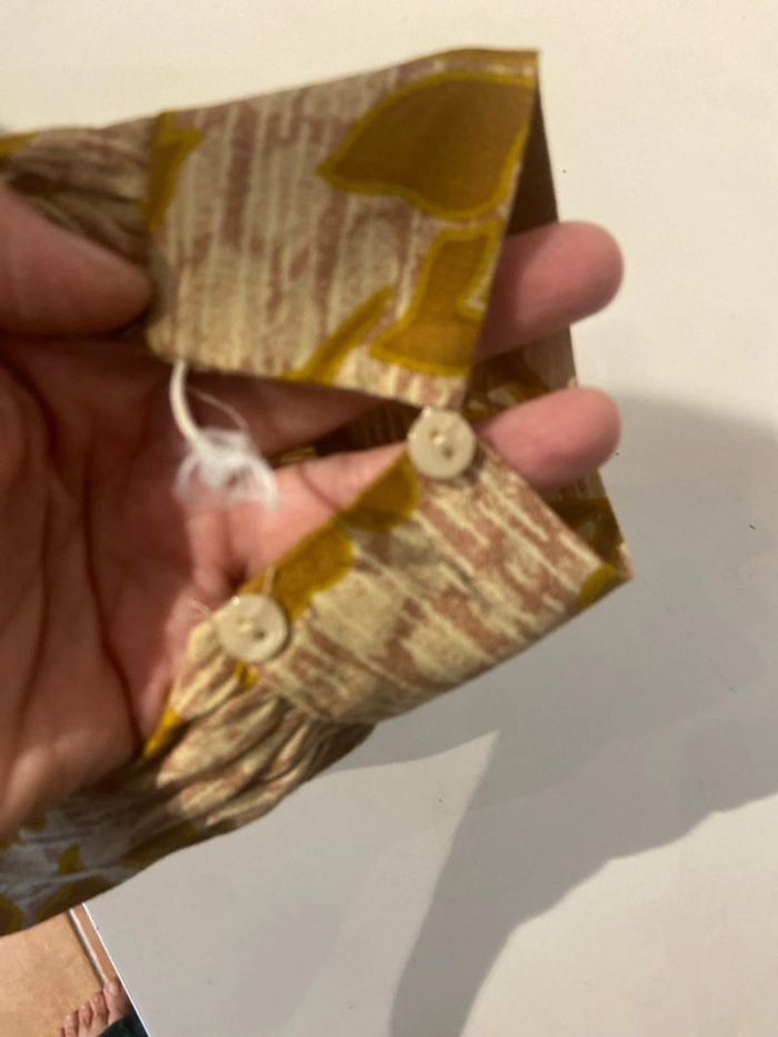 Avec motif fleuri couleur moutarde marron Kamal magnifique robe longue manches larges cintré ajouré dans le dos nu A noter que les élastiques des manches sont decousu. Il y en a deux par manche Seul un des deux est decousu