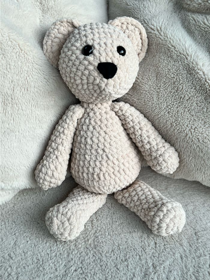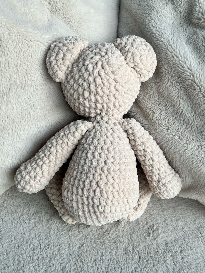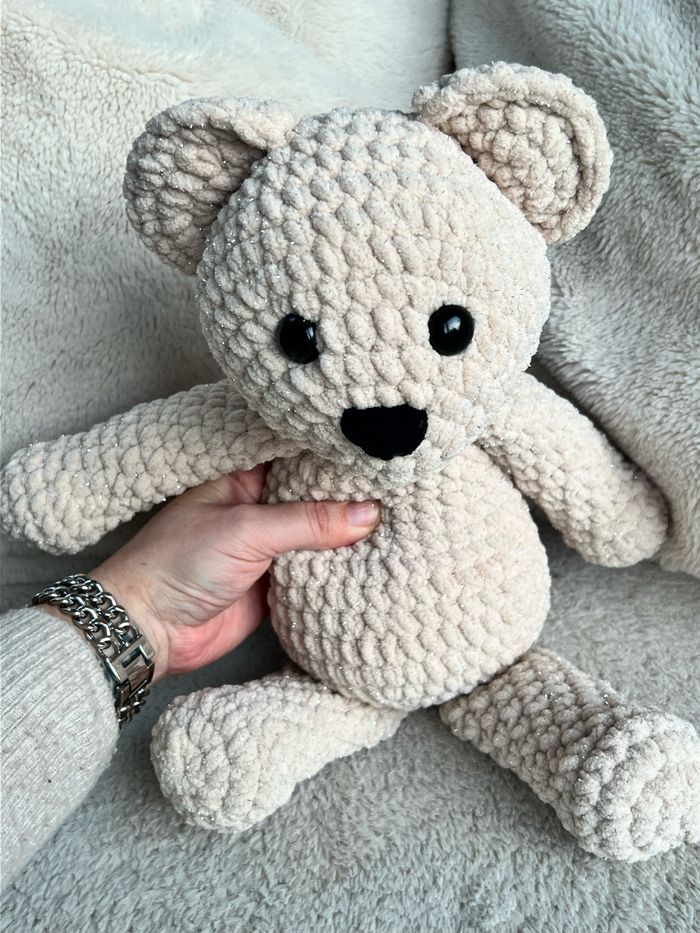 Jolie peluche ourson fait main au crochet avec un fil beige pailleté or. La couleur peut être légèrement différente. Entièrement réalisée à la main par mes soins avec de la laine chenille (polyester), des yeux de sécurité (plastique) et du rembourrage (polyester). Attention ce produit ne convient pas aux enfants de moins de 3 ans. Contactez moi pour plus d’info Insta : myeacrochet #crochet #amigurumi #amigurumicrochet #amigurumis #ourson #peluche #faitmain