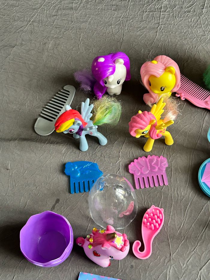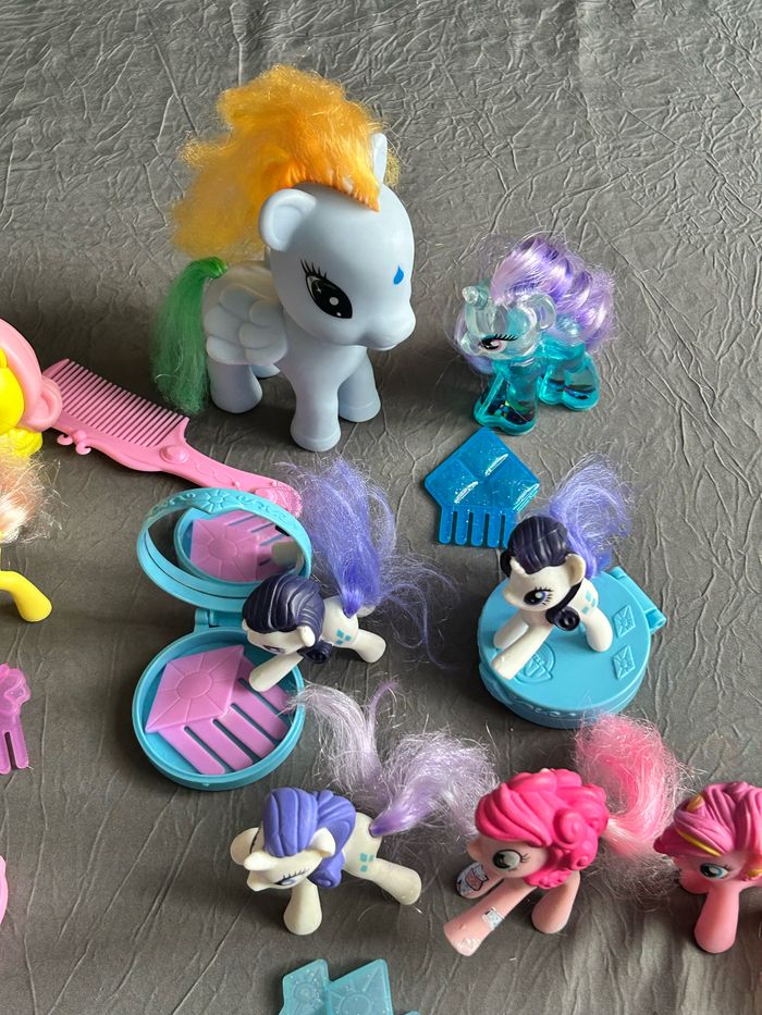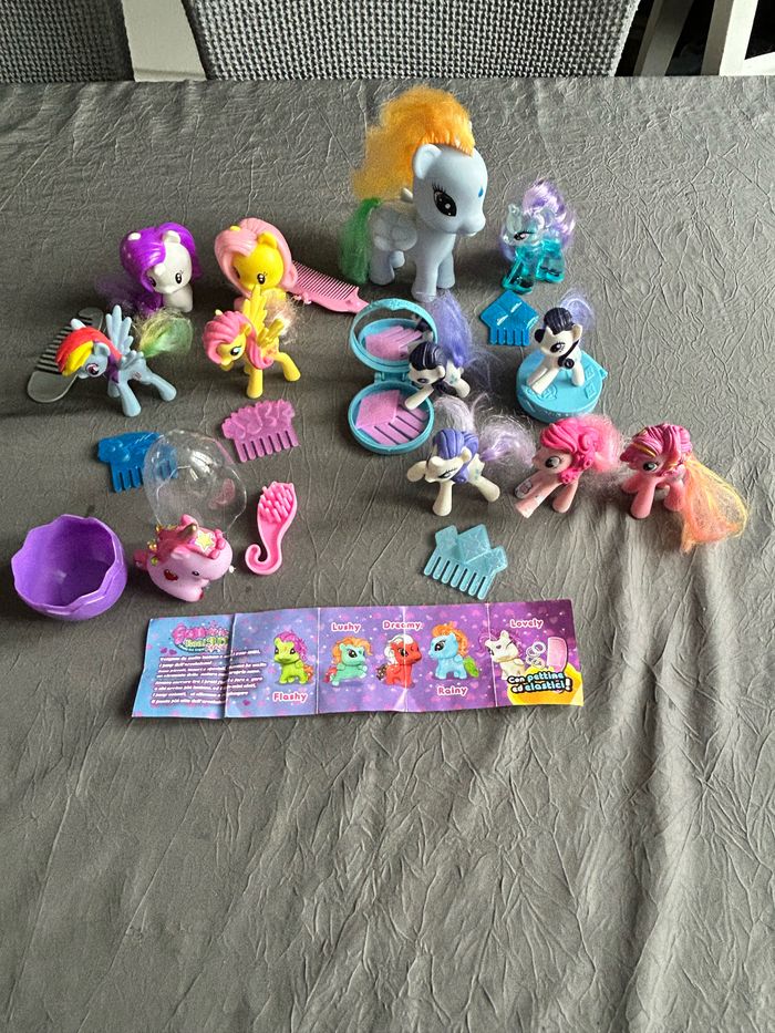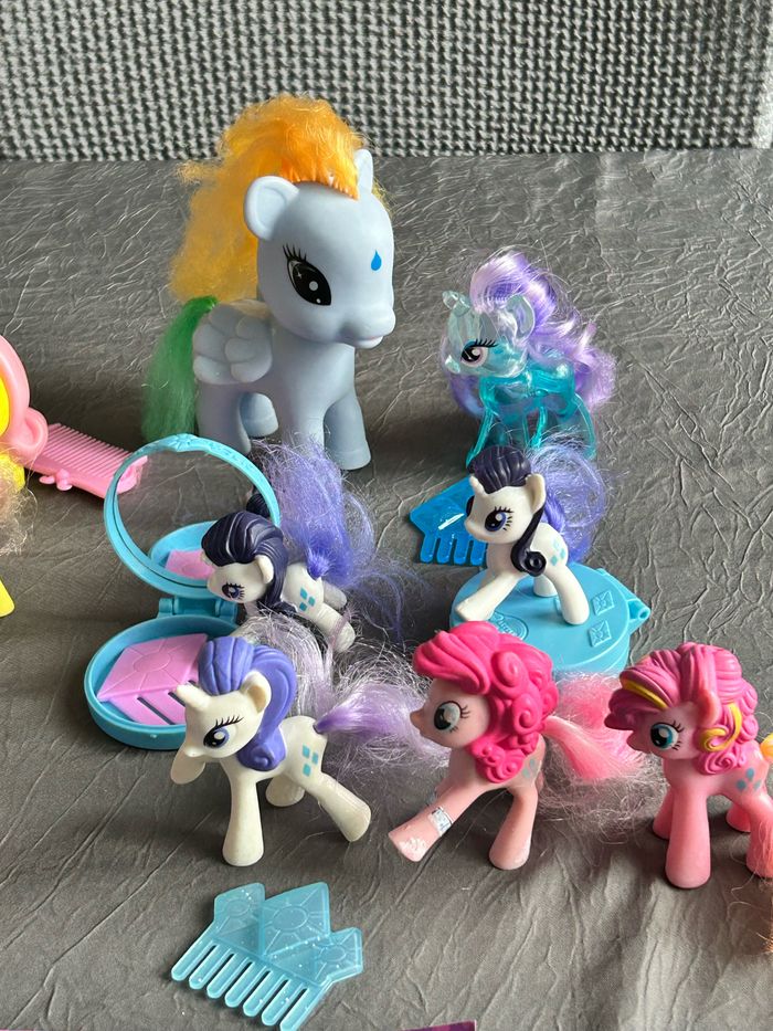 Voici un lot de 12 figurines de petits poneys et leurs accessoires ! Parfait pour les fans de My Little Pony qui souhaitent compléter leur collection ou pour les enfants qui veulent s'amuser avec ces jouets mignons. - 12 figurines de petits poneys de différentes tailles et modèles. - Accessoires assortis (peignes, brosses, etc.) - Jouets en bon état