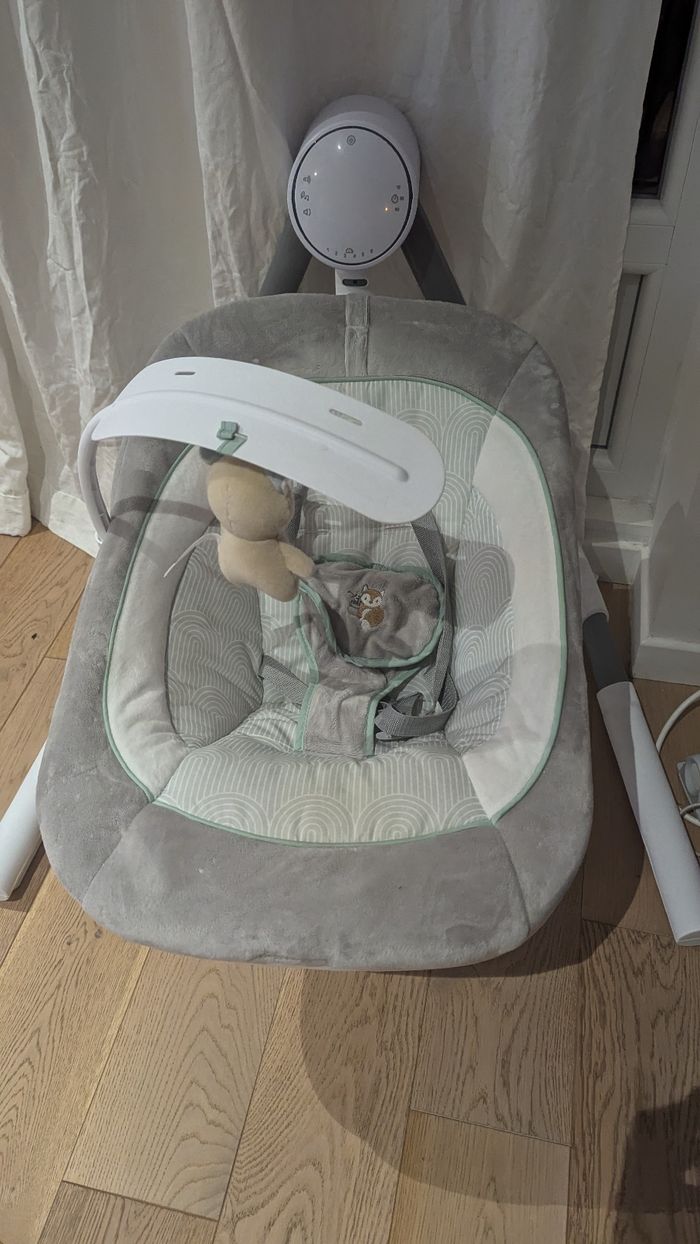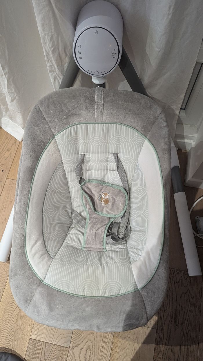 - Siège pivotant à 180º dans 3 directions différentes. - Pliage, transport et rangement faciles. - Fonctionne avec piles ou sur secteur via câble USB. - 16 chansons, 2 sons nature et sons blancs disponibles. Contrôle parental volume. - Balancements calmes ou siège avec vibrations. - Barre d'activités pivotante (cassée : peut être glissée dans le trou prévu sans être fixée : voir photos). - Appuie-tête pour nouveau-né qui peut être retiré. - Harnais avec 5 points d'attache Valeur à l'achat : 90€