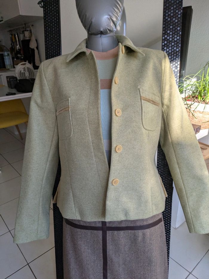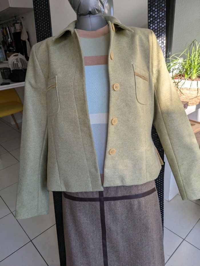 Belle veste vintage 80% laine couleur vert amande. 2 poches plaquées avec bordures velours. Très bon état, voire neuve. #parfoisoui44 #parfoisouifemme44 #parfoisouiveste #vestevintage #manoukianfemme