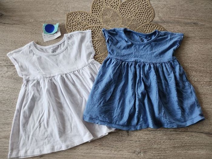 Joli lot de 2 robes manches courtes 1 bleue et 1 blanche En tres bon état la blanche n'a pas été portée donc neuve étiquetée. 9 mois Tex 3€