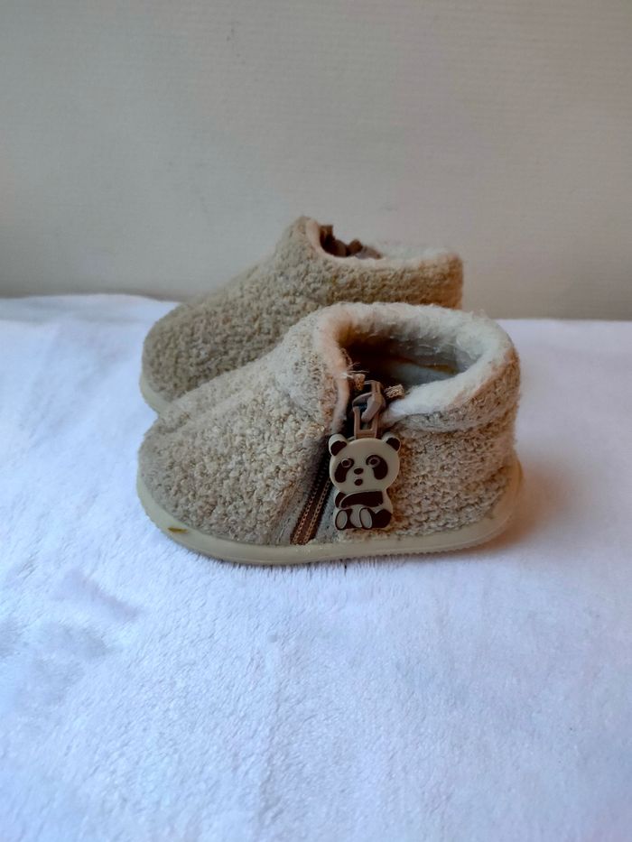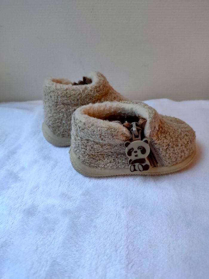 Chausson bien chaud, moumoute, coloris mixte beige et blanc, fermeture éclair sur le côté. Marque Pat et Ripaton, taille 16. Ils sont en très bon état. Prix ferme, PAS DE NÉGO !!!