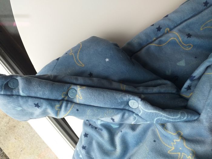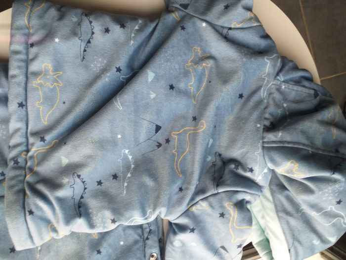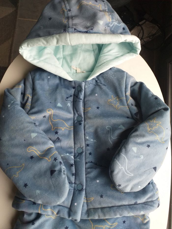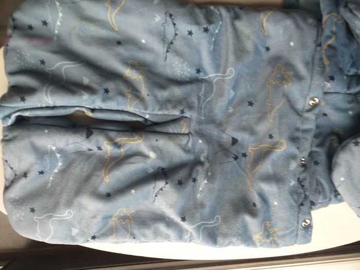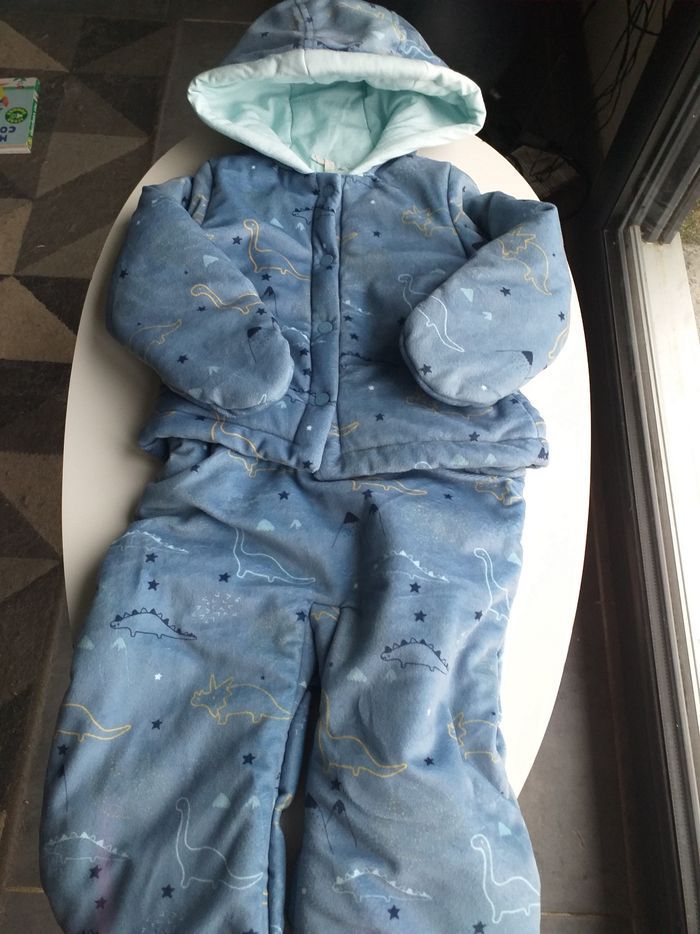 Une jolie combinaison avec une veste avec une capuche à fermer avec des pressions, les mains peuvent être cachées. Le pantalon est à fermer avec des pressions avec les pieds fermés. Tout doux, juste utilisé quelques fois. Acheté neuf chez Orchestra
