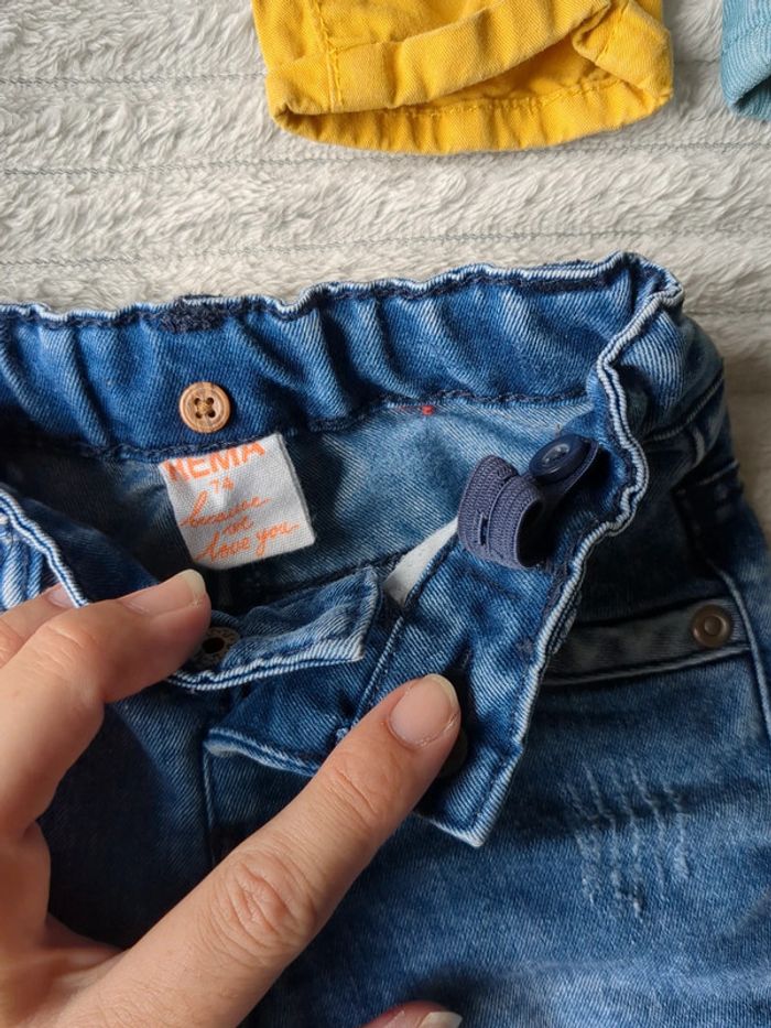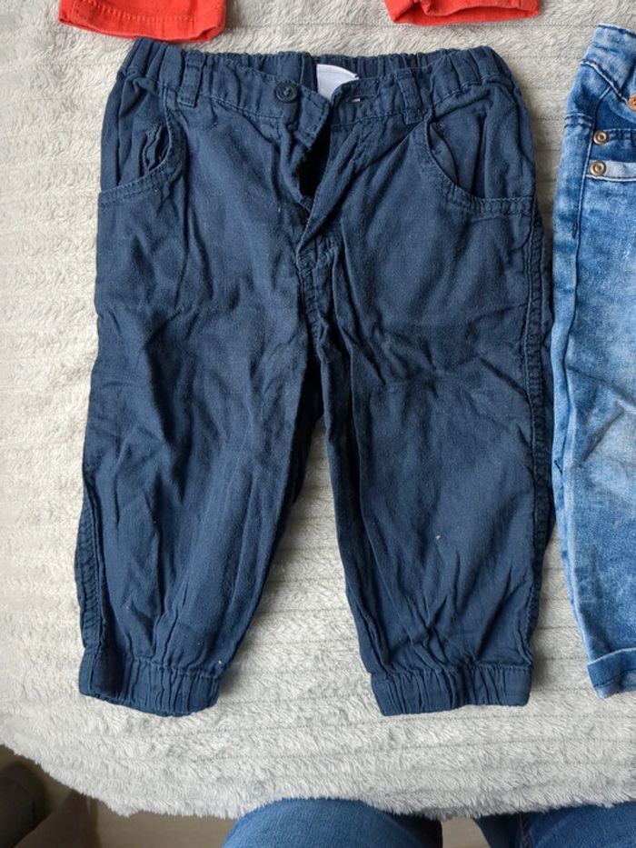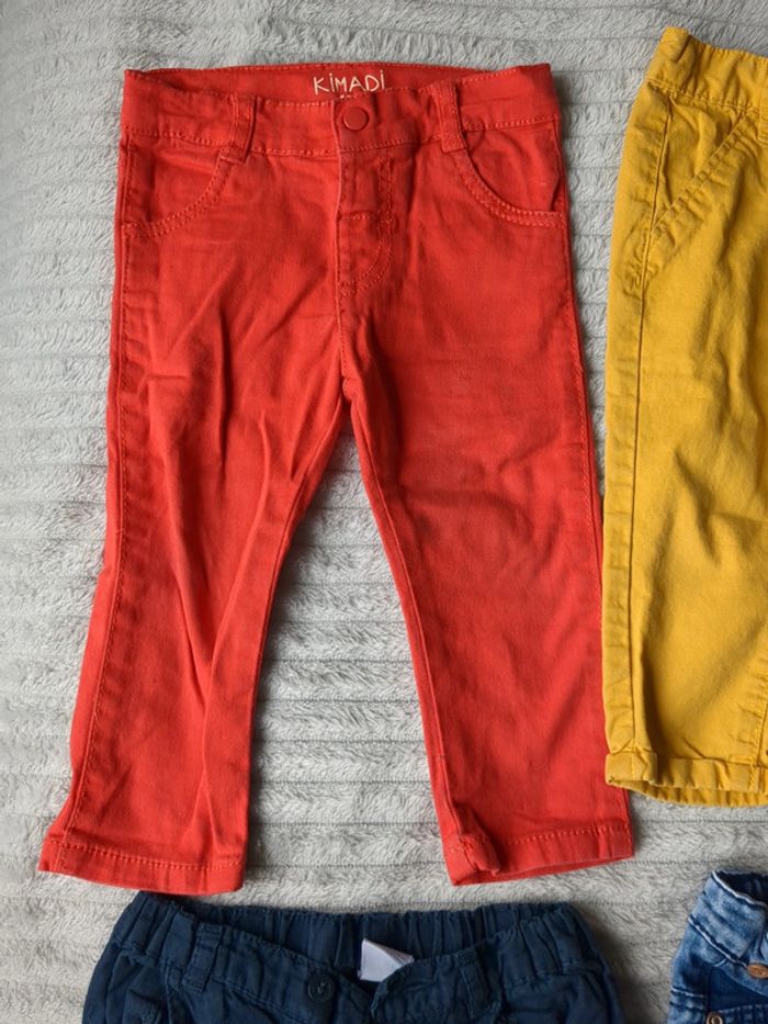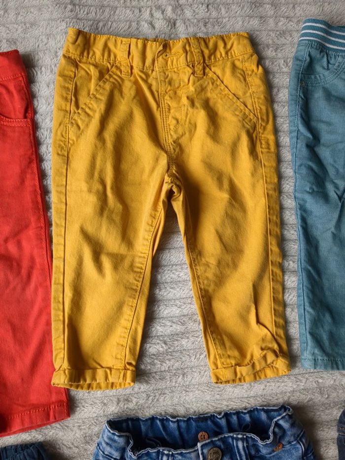 Pantalons 74cm diverses marques. 4 jeans bleus, 1 jean rouge, 1 jean jaune, 1 pantalon en velours bleu clair, 1 pantalon en toile bleu marine et un pantalon fourré en polaire bleu marine. Diverses marques : petit bateau, Hema, bout'chou, Kiabi, Disney, kimadi, obaibi... Portés mais en très bon état général